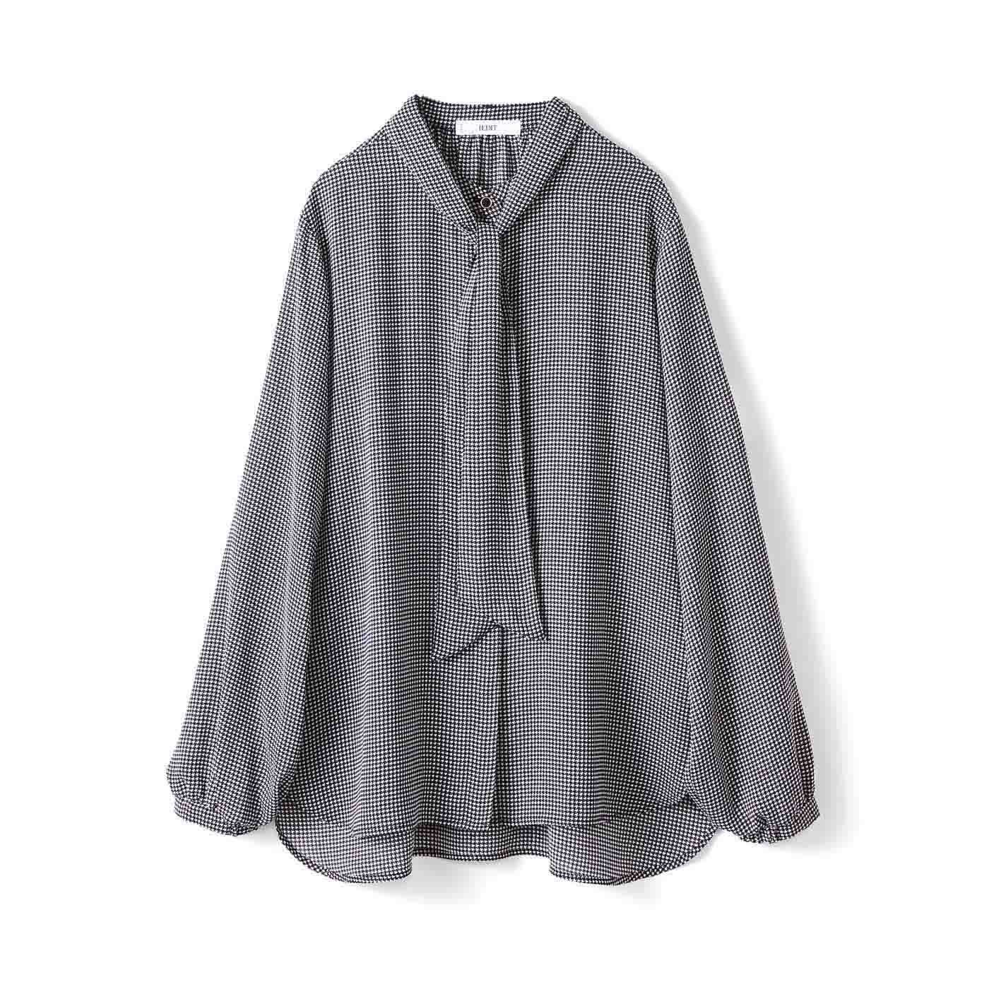 モノトーンのプリントブラウスに、タイトシルエットのロングスカートを合わせた大人女性らしいスタイリング。ブラウスはボウタイ付きで、リボン結びにすれば華やかに、ひとつ結びでたらせばシックにと、気分やシーンによってアレンジを楽しめます。黒のかっちりした小物を合わせて、洗練されたモノトーンコーデに仕上げます。