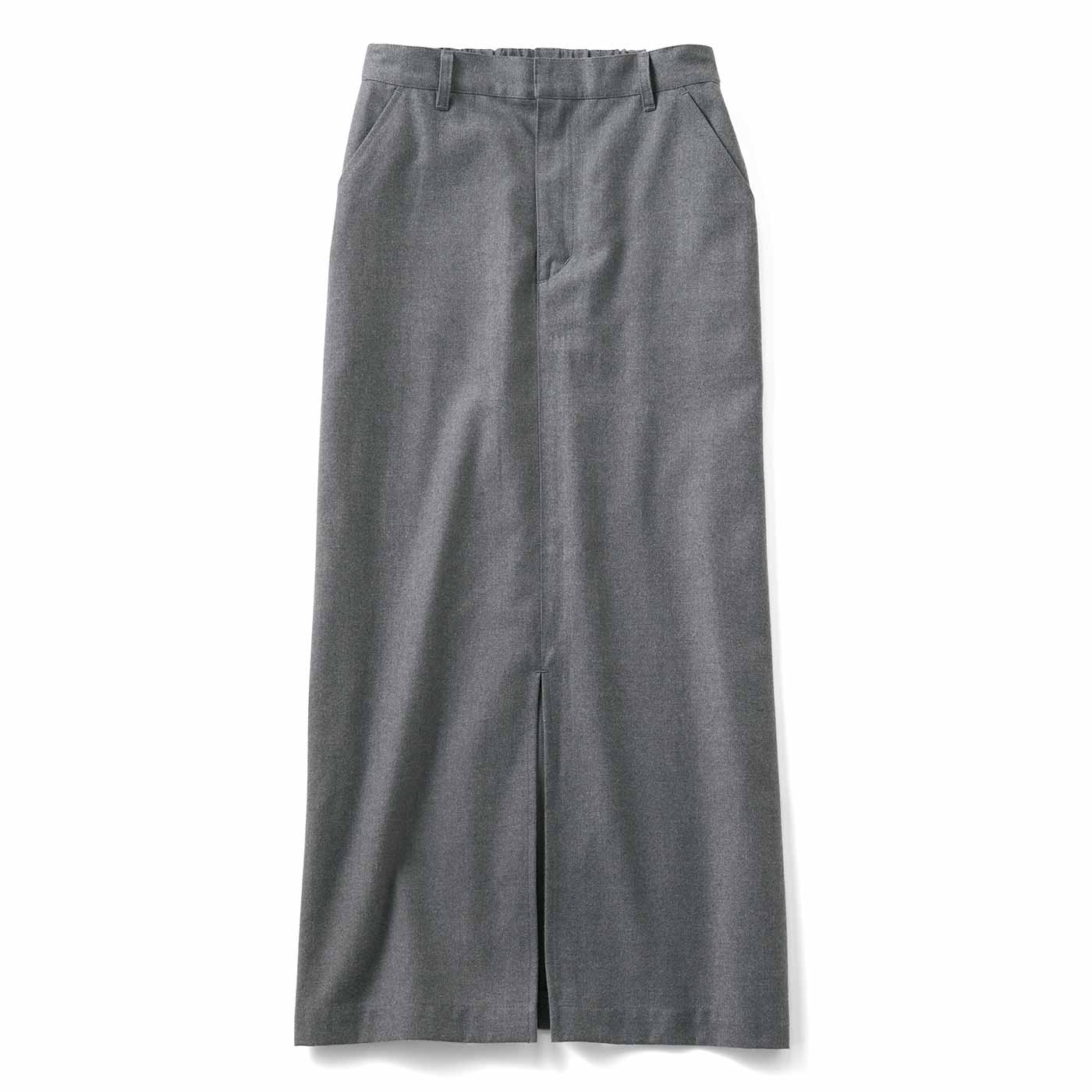 清潔感たっぷりな水色ストライプシャツに、くるぶし丈のロングスカートを合わせたかっちり感のあるスカートスタイル。スカートは広がりすぎないシルエットだからロング丈でも華やかすぎず落ち着いた印象です。寒さ対策のニットはさらりと肩掛けにしてこなれ感アップ。重心が上がりスタイルよく見せてくれます。
