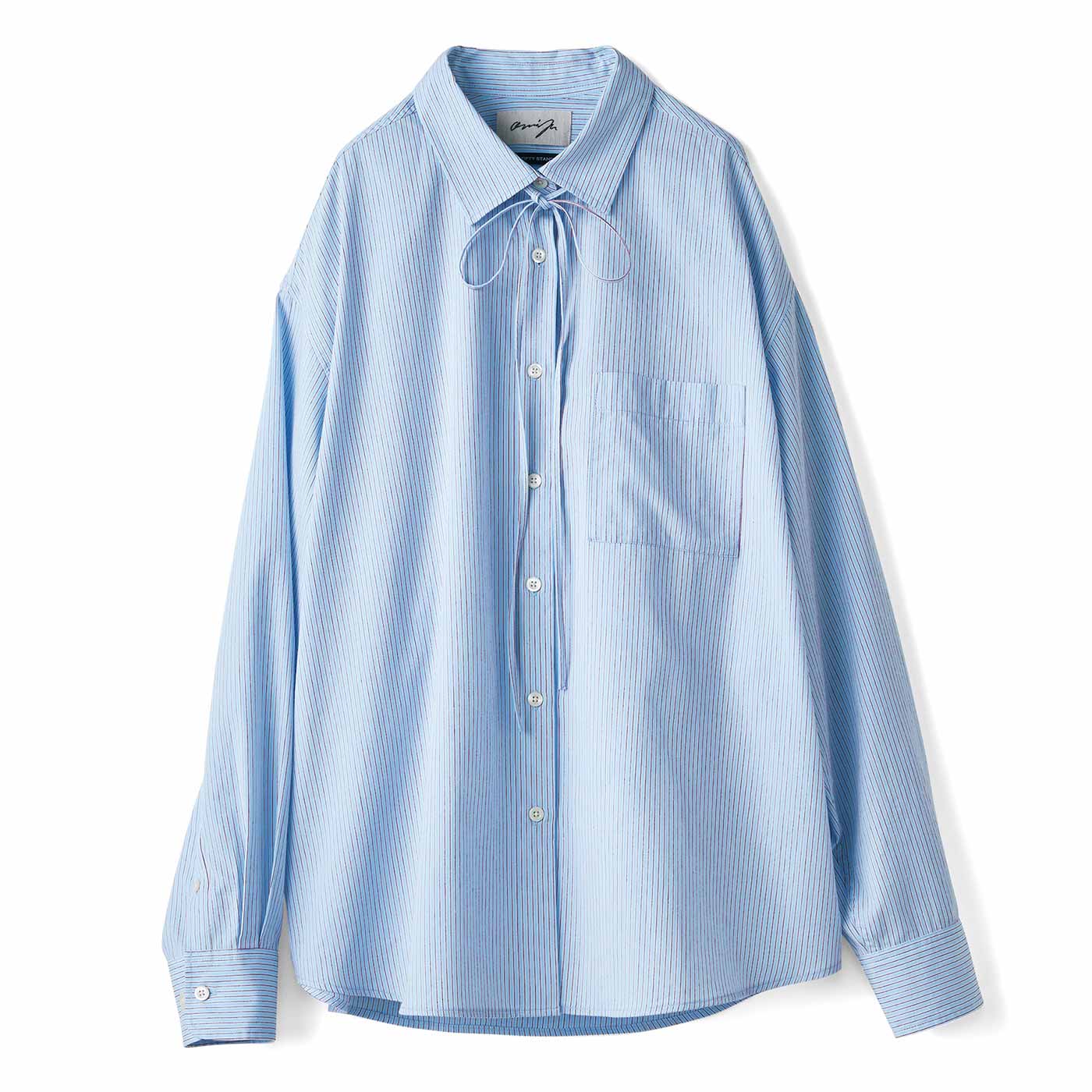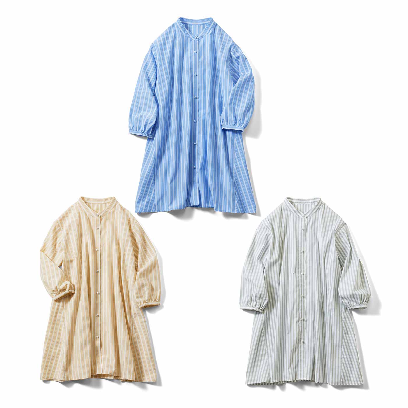 清潔感が出せるアイテムといえばストライプシャツ。爽やかで夏らしさがあるのに、腕を出さなくて済むのも参観日におすすめのポイントです。さらにパールボタンのデザインが、アクセサリー要らずで華やかさを加えてくれます。トップスにブルーの色味がある分、他のアイテムはシンプル&モノトーンでまとめると好相性です。