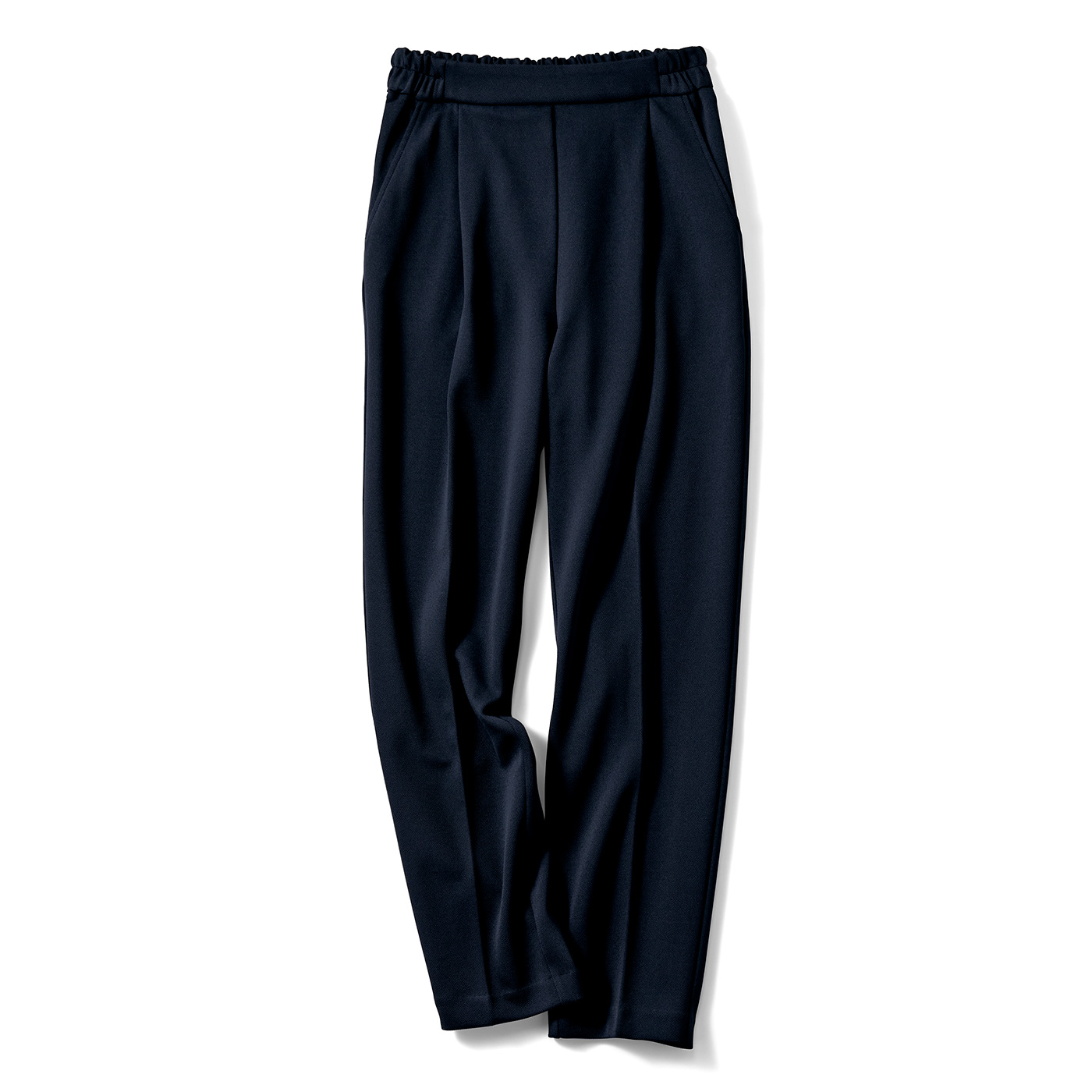 きれいめコーデに大活躍するベーシックなテーパードパンツに、ニット素材のノーカラージャケットを合わせて、こなれた華やぎスタイルに格上げ。インナーに白のタートルネックを重ねれば、さらに顔まわりがぱっと明るい印象に。オフィスもOKなきちんとコーデなので、授業参観の前後に出社する働くママにもおすすめな装いです。