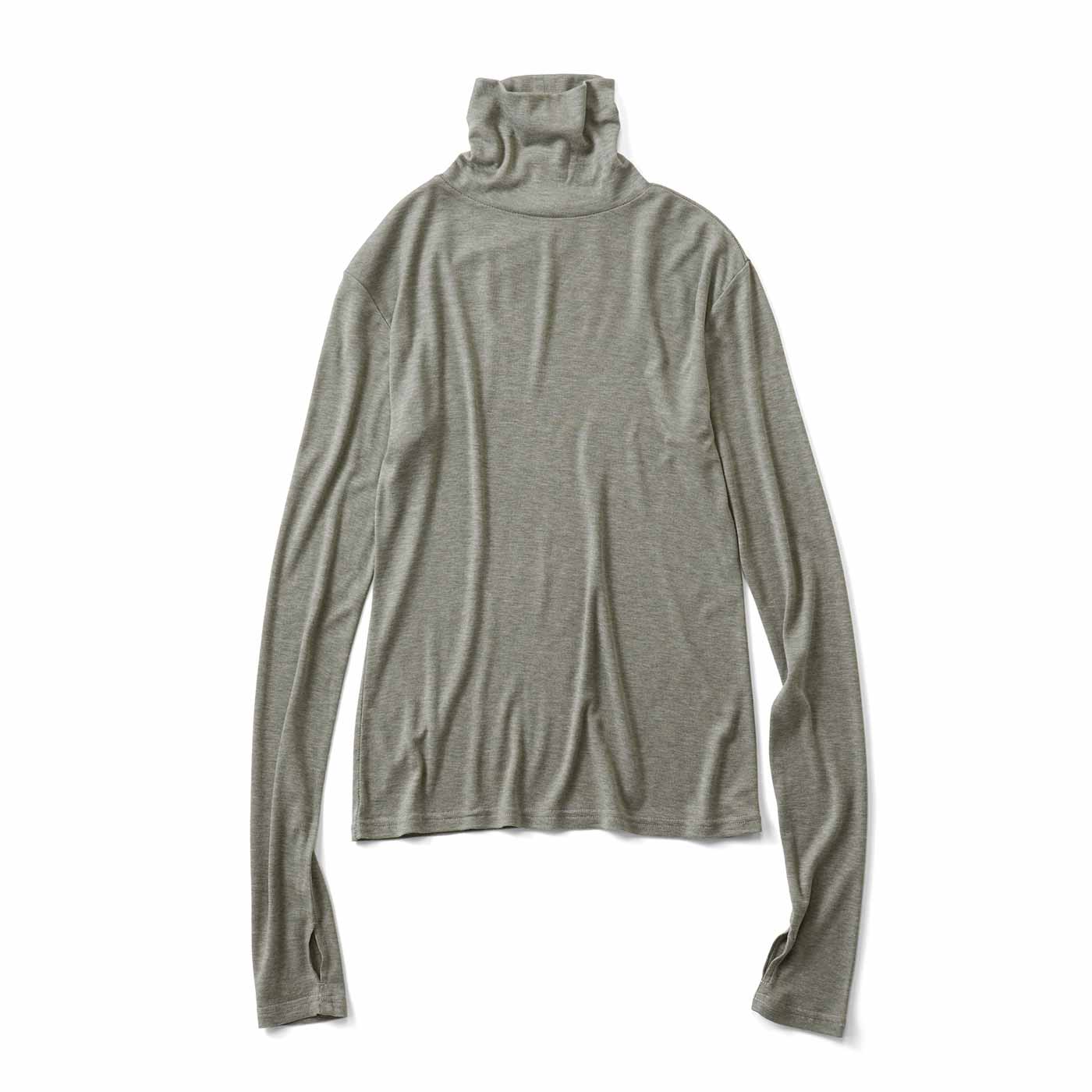 知的で爽やかなブルーのシャツは、どの年代からも好感度の高いアイテム。1枚でさらりと着るだけでサマになりますが、今年は薄手のタートルネックトップスと重ね着するのもおすすめ。着こなしに奥行きが生まれて、こなれ感のあるハンサムコーデに仕上がります。重心が上がって見えるので、ゆったりシルエットのパンツと合わせてもスタイルよく決まります。