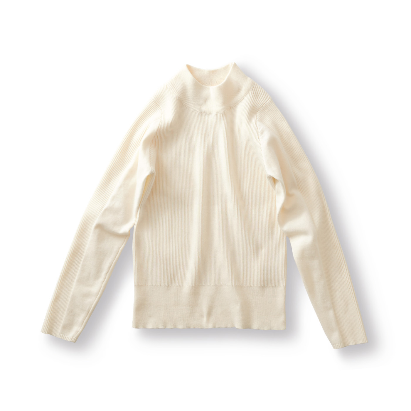 ベーシックなハイネックトップスに、ゆったりしたワイドパンツを合わせたメリハリのあるパンツスタイル。落ち着いた印象ではあるものの、パンツはややリラクシーなシルエットなので、足もとは白ローファーで引き締めるのが◎ 華奢なシルバーアクセを添えてクラスアップしたら、決めすぎないきれいめ大人コーデの完成です。