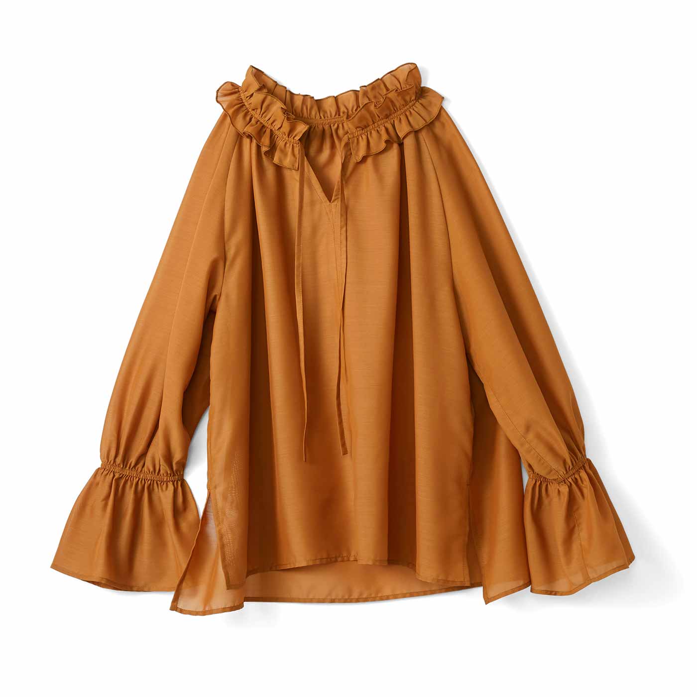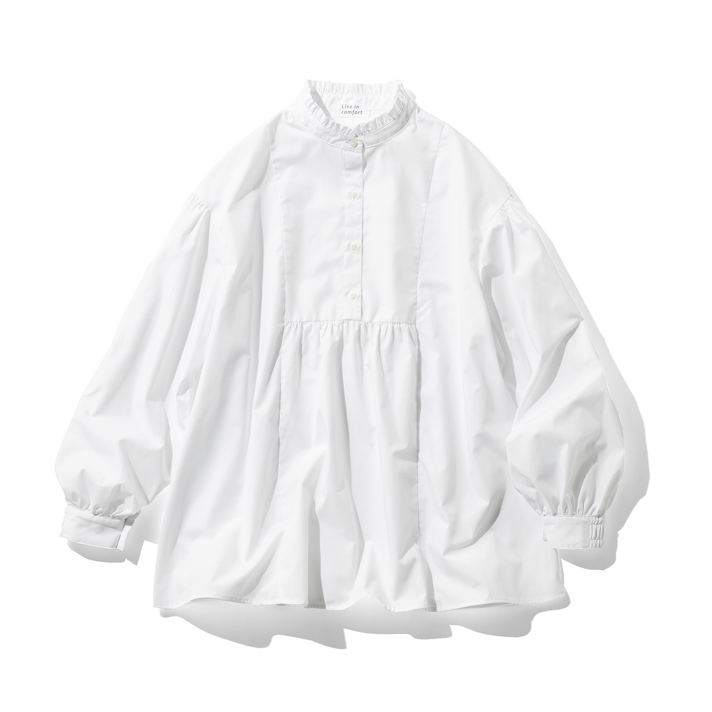 ハリ感のある白のブラウスは、清潔感たっぷりで好印象なこと間違いなし。首もとのフリルやボリューム袖がこなれた印象で、1枚でもしっかり着映えます。トップスが華やかなぶん、ボトムスは辛口アイテムで引き締めるとちょうどいいバランスに。落ち着いたカーキ色のワークパンツを合わせれば、春夏らしい爽やかな大人コーデのできあがりです。
