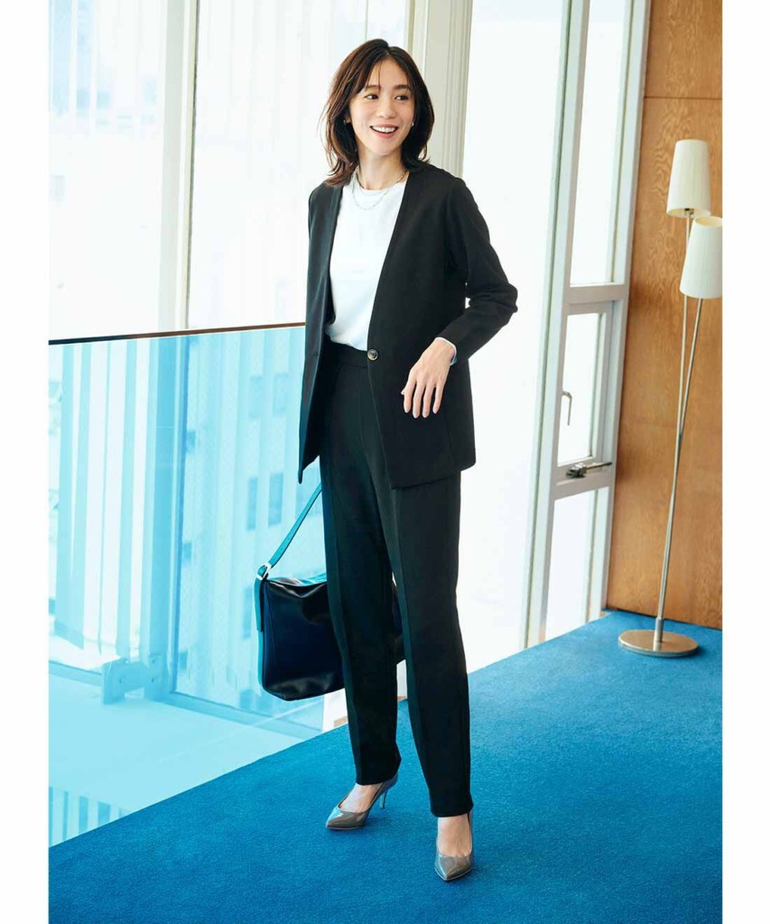 スーツのオフィスカジュアルはノーカラーで垢抜け感を