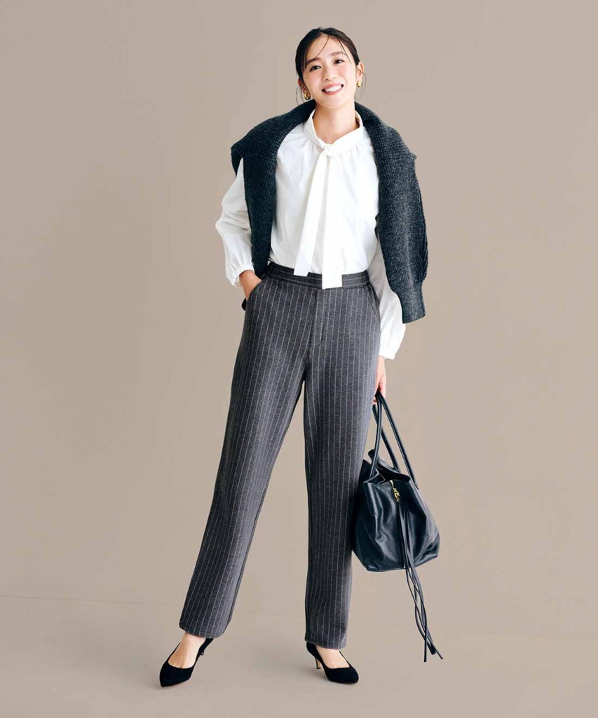 光吸収発熱素材のきれいめパンツは、重ねばき不要のあたたかさ。ほどよいゆとりのテーパードシルエットで、すらりとスマートにはきこなせますよ。シックなグレーストライプなら、きちんと感も◎です。旬のボウタイブラウスは、ラフに垂らしてハンサムに。肩掛けニットを加えたら、お手本オフィスコーデの完成。