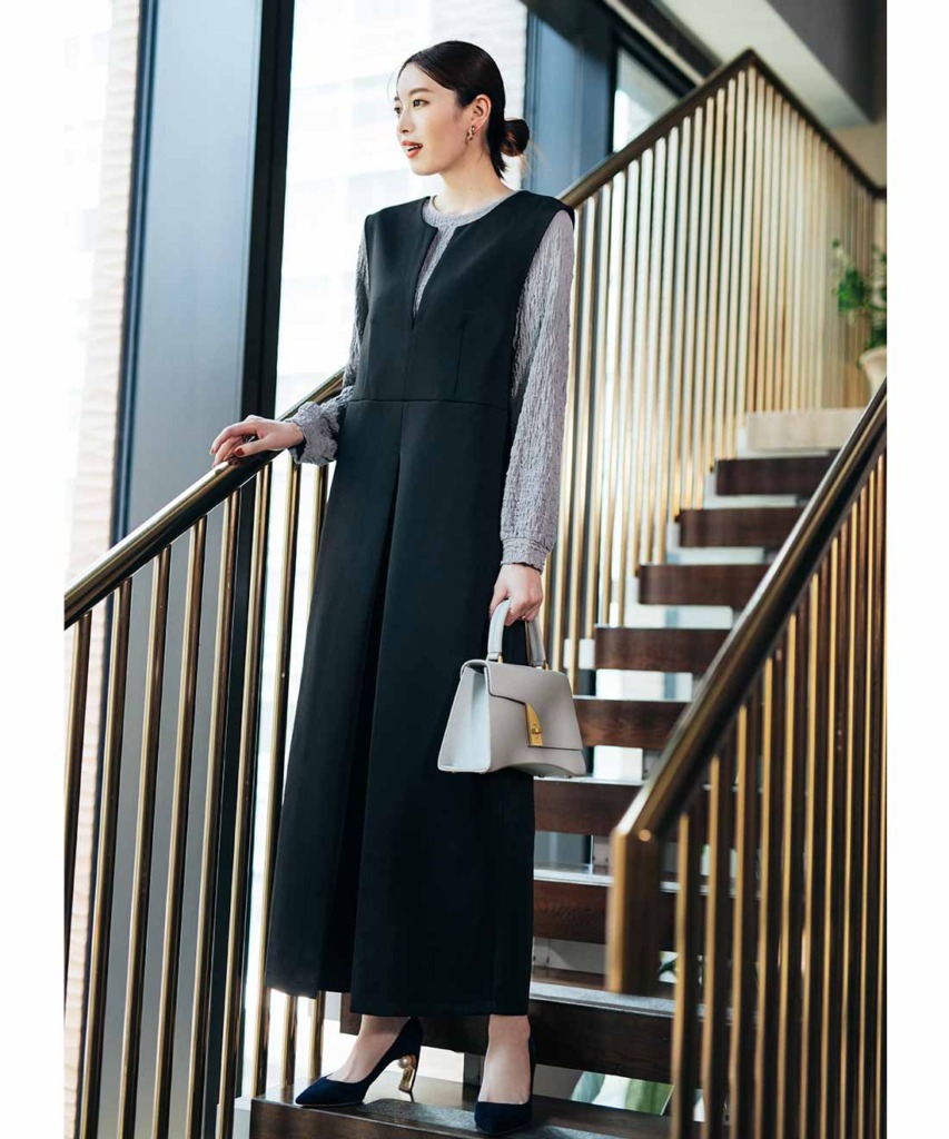 キーネックの上品ジャンパースカートで防寒&おしゃれを両立