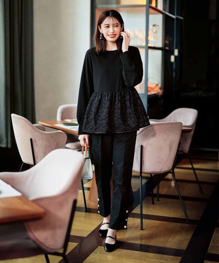 暗くなりがちなブラック×ブラックは、デザインがあるものを選んで立体感を出しましょう。黒のプルオーバーは、フラワーレースで切り替えたフレアーで華やかに。すっきりとした黒のテーパードパンツは、すそのパール調ビジューがアクセント。お仕事はもちろん、式典などのきちんとシーンにも使えるコーデです。