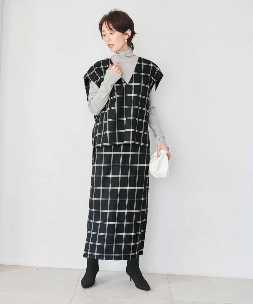 ブラック基調のウィンドウペンチェックが上品な、ベスト×スカートのセットアップスタイル。派手すぎず上品に着こなせるので、肌寒い日のお仕事コーデにぴったりです。インナーは、ライトグレーのタートルネックで大人らしく。からだに沿わないIラインシルエットなので、さりげなく体形カバーも期待できますよ。
