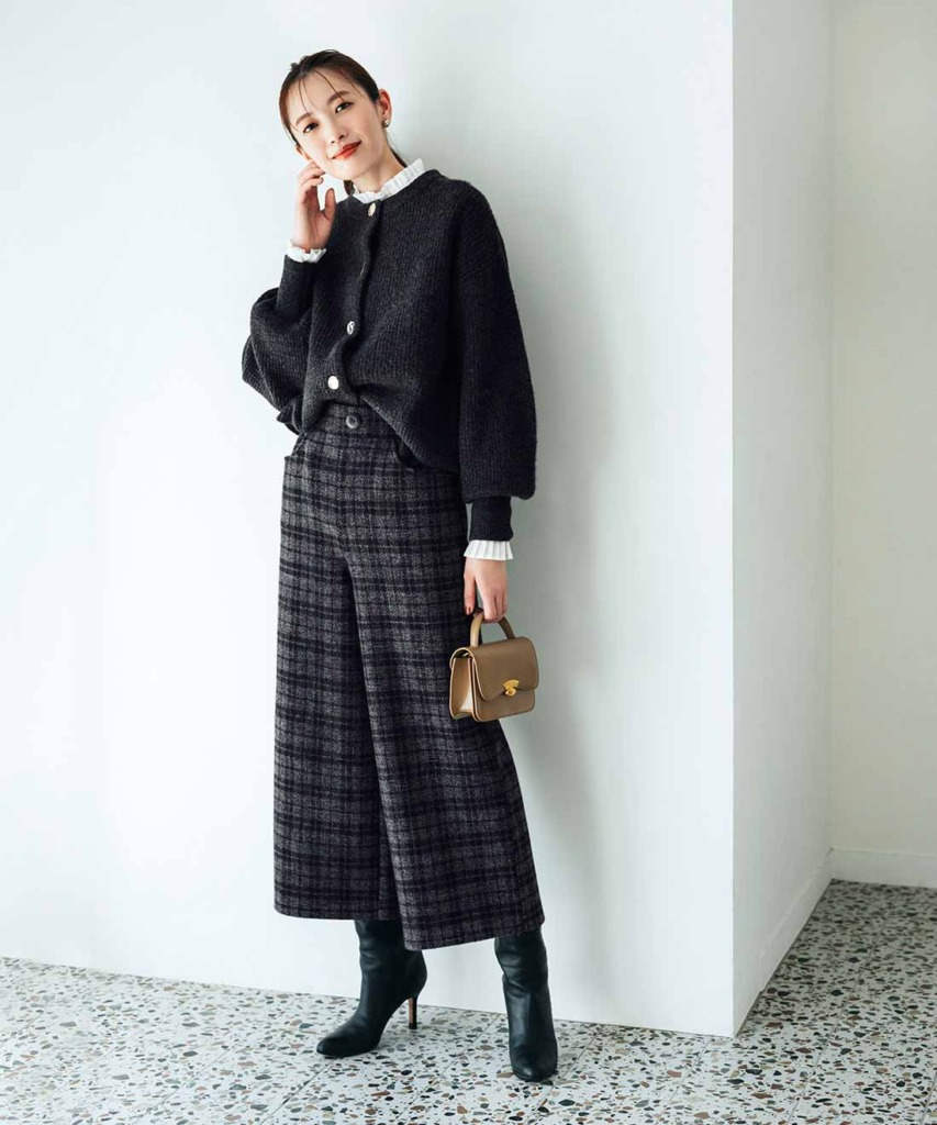 寒さがきびしい日は、オフィスコーデにきれいめブーツを取り入れましょう。クロップド丈のワイドパンツなら、ブーツともバランスよく決まります。暖かみのあるブラック基調のチェック柄で、さりげなく季節感を意識。カーディガンからブラウスのフリルを覗かせることで、顔まわりの印象がパッと華やぎますよ。
