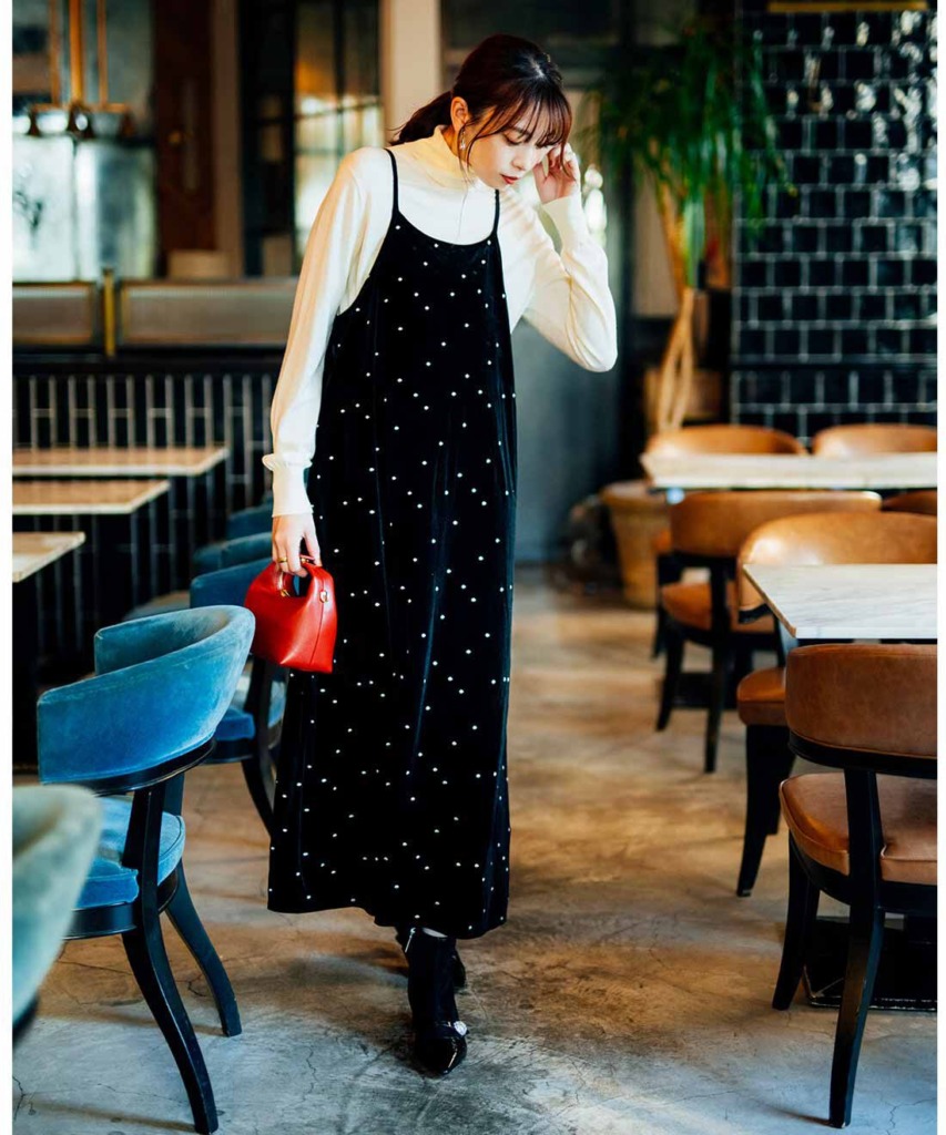しっかり防寒したい日は、タートルニット×キャミワンピースの組み合わせが◎。カジュアルに見えないよう、きれいめ素材を選びましょう。ランダムドットがキュートなキャミワンピは、上質感のあるベロア調。タートルニットは、滑らかなシルク混素材です。モノトーンでまとめて、大人らしいコーデに仕上げます。