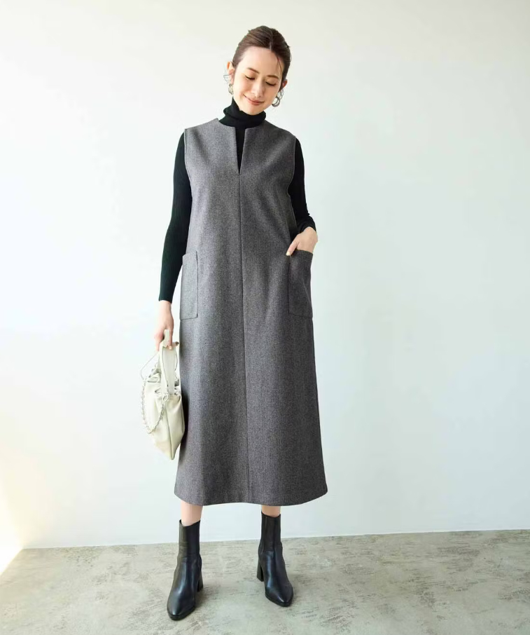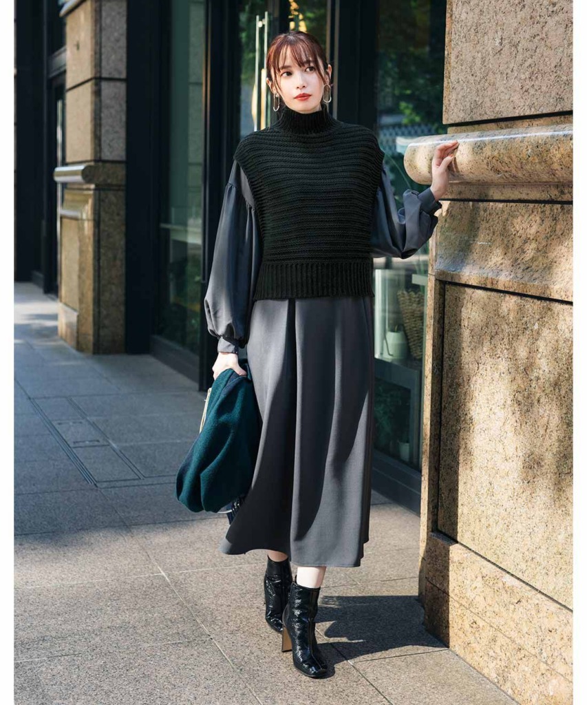 タックワンピース×ハイネックベストで上級感のある装いに