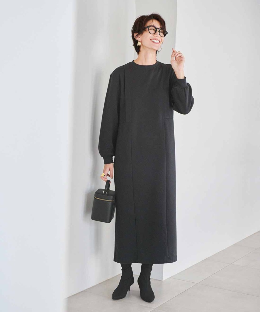 寒すぎて気分が憂うつな朝は、すぽんと着るだけで決まる、裏起毛の大人ワンピースが味方。タックを入れて立体的なシルエットにすることで、カジュアル感を大幅に軽減しています。ほどよいロング丈なので、ブーツとも好相性です。黒小物とゴールドアクセサリーを加えて、旬らしさ満点のコーデに仕上げます。