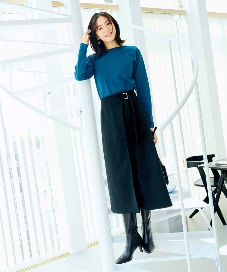 フェミニンなスタイルが苦手な方でもはきやすい、巻き風デザインのロングスカート。直線的なシルエットと飾りベルトで、甘すぎない大人の着こなしが叶います。ほどよい丈感なので、ロングブーツを合わせるのもおすすめです。ダークブルーのトップスを合わせて、クールで知的なオフィスカジュアルコーデに。