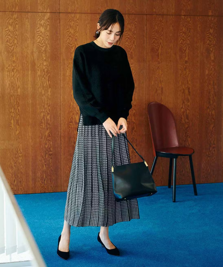 コーデに迷う朝は、そのまま着るだけでコーディネートが完成するセットアップスタイルが便利。シンプルなニット×上品なジャカードスカートで、着映えコーデが即完成します。シックなモノトーンなら、どんなシーンにもなじみますよ。バッグとパンプスも黒でまとめて、大人らしい冬コーデに仕上げましょう。