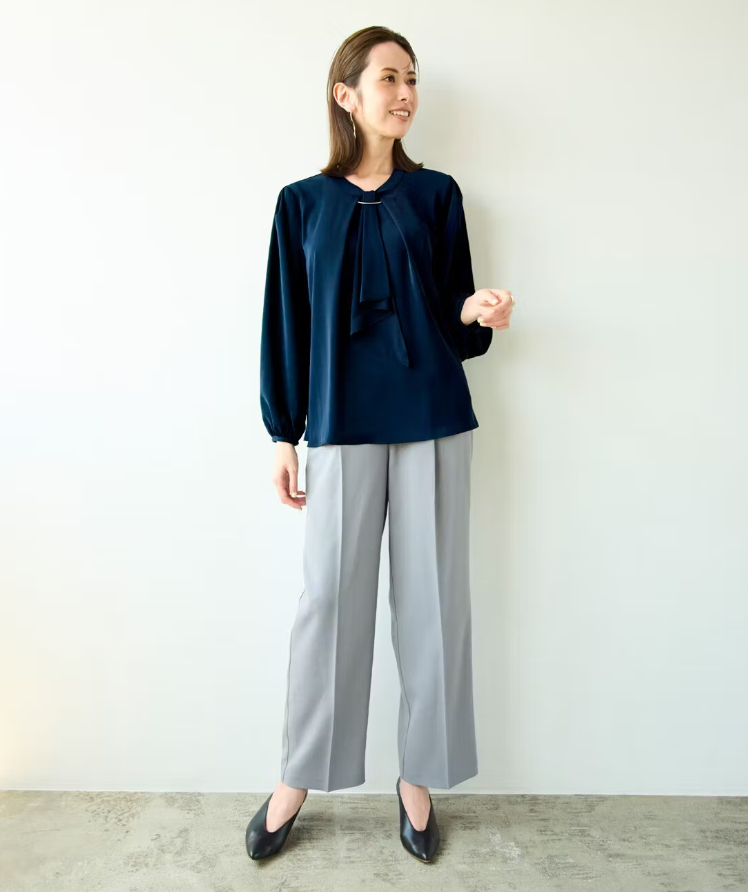 年中使えるシフォンブラウスは、シックなネイビーで季節感を意識。きらりと光るゴールドパーツ&ボウタイ風デザインで、ネックレスなしでも華やかに決まります。ライトグレーのきれいめパンツは、美脚見えするセンタータック入り。シンプルでありながら、着痩せも着映えも叶うオフィスカジュアルコーデです。