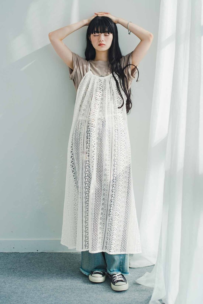 たっぷりとしたフレアーラインに、幾何学柄レースがかわいいキャミワンピース。甘すぎないデザインなので、カジュアルスタイルにもさらりとなじみます。ラフなTシャツ×デニムパンツに合わせれば、上級レイヤードコーデの完成。足もとは、ローカットスニーカーが好相性です。