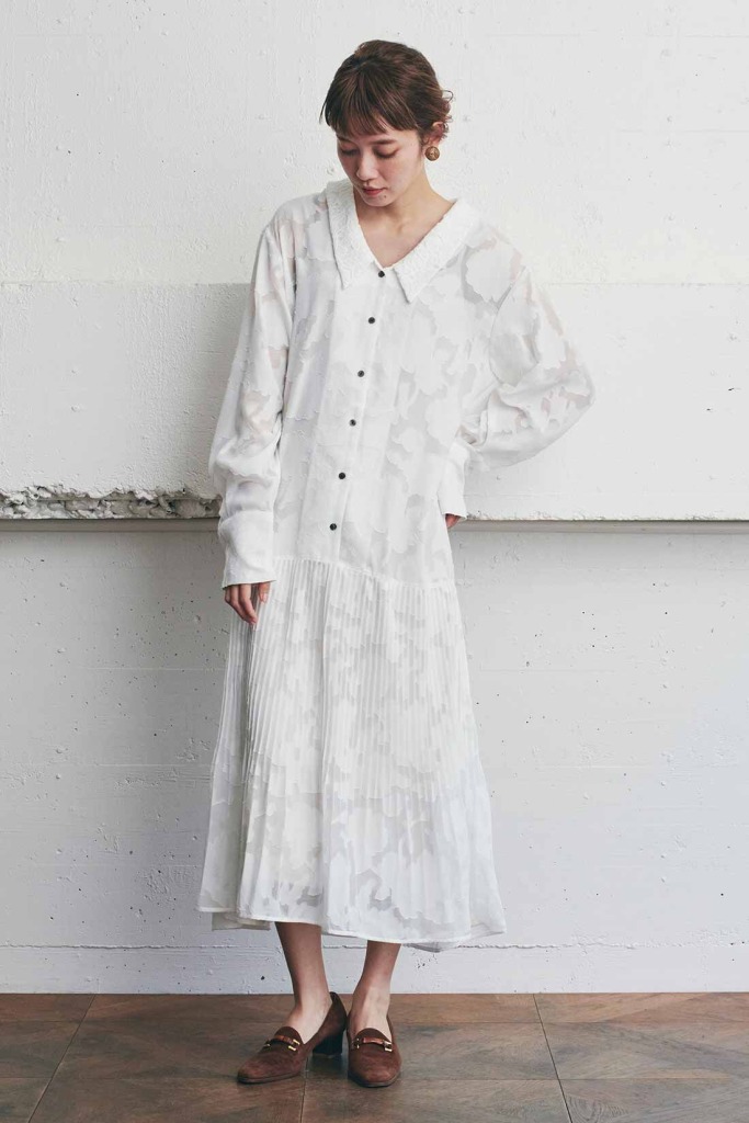 シアーな花柄カットジャカード素材に、レースの衿がレトロなワンピース。スカート部分はプリーツで切り替えて、トレンド感も取り入れた一着です。黒ボタンでアクセントを効かせているので、シンプルに着るだけで決まります。足もとはローファーで、ボリュームを足すのが正解です。
