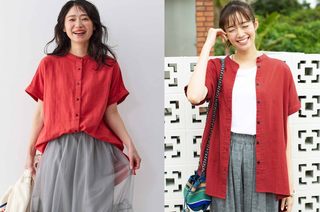 汗をかくことが多い夏、特に肌に触れる服の素材感が気になるところ。このブラウスは綿100%のダブルガーゼ素材かつ、風を通すようなふんわりとしたシルエットだから着ていて気持ちいいんです。バンドカラーなのでシャツのボタンをとめるときちんと感を出せるし、ボタンを開けてはおりにも使えるのが便利。フレンチスリーブで二の腕の隠れ具合も絶妙!まさに素材、シルエット、着心地、着回し度、すべてをかなえる夏の優秀シャツ。(エディターM)