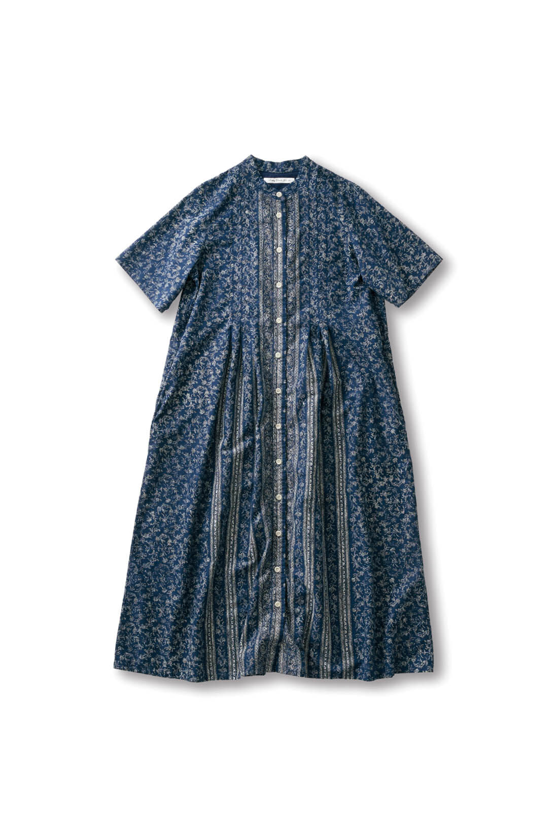 ナチュラルなネイビーのワンピースは、よく見ると繊細なバンダナ柄。柄を畳むようにしてつくったタックが、ストライプのような視覚効果を出しています。ゆったりとした着心地ながら、縦のラインで着痩せして見えるのがうれしいポイント。夏らしいワンピースには、かごバッグが似合います。
