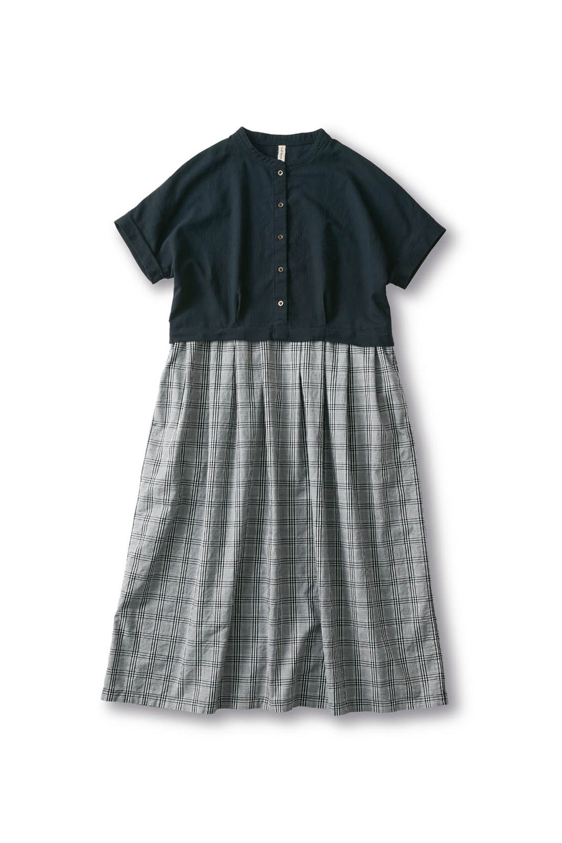 バンドカラーの黒ブラウスに、チェック柄スカートを組み合わせた、ドッキングワンピース。総柄のワンピースは派手すぎないか心配…という人でも、さらりと着こなせますよ。シックなモノトーンですが、柄入りなので暗い印象にはなりません。足もとはブラウンで、ナチュラルに仕上げます。