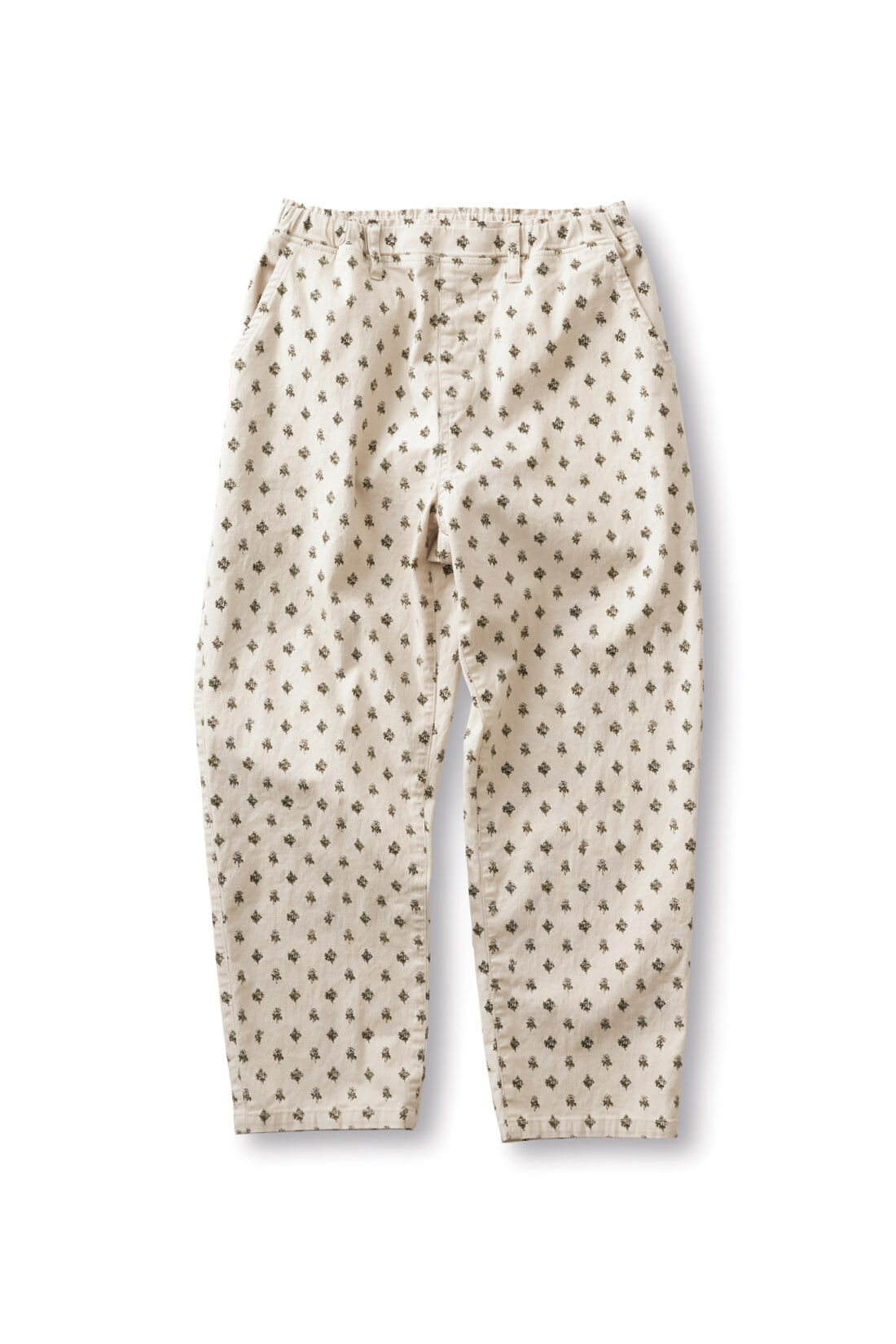 アイボリーの小紋柄パンツで無地トップスにアクセントを