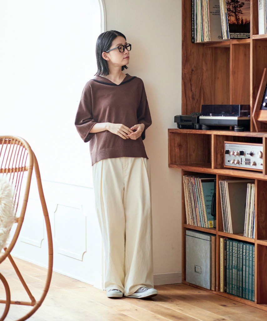 秋といえばニットの季節ですよね。綿麻糸を使ったニットならドライなタッチかつ風が通って涼しい上に、秋っぽく見せられます。チョコレートのようなブラウンもポイント。セーラーデザインがガーリーな印象ですが、ラフなアイボリーのパンツと合わせることでカジュアルダウン。大人っぽく仕上がり照れなく着こなせますよ。