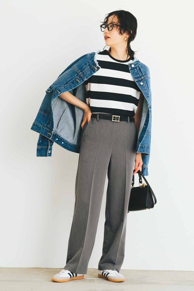 トレンド感のあるワイドストレートパンツは、オンでもオフでもこなれコーデを作ってくれる便利アイテム。カジュアルなボーダーTとデニムジャケットに合わせると、カジュアル度を抑えてくれて、大人っぽいコーデが完成。外しアイテムとして縁の太めのメガネやスニーカーなどを合わせれば、モダンな休日スタイルになります。