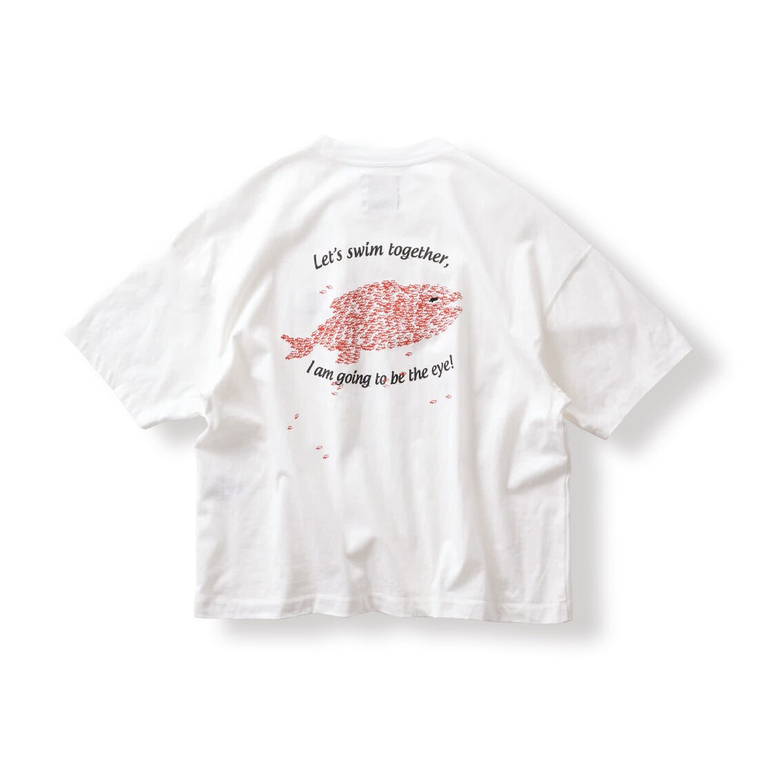 ちなみに、シンプルに見えるこの白Tシャツ、実はバックスタイルは“ひとひねり”されているんです。遠い昔に見た記憶があるこの絵柄……。そう、「ぼくが、目になろう。」と言って仲間とともに泳ぐスイミーです! 赤い魚たちはプリントで、黒いスイミーだけが刺しゅうになっているところにも、キュン!