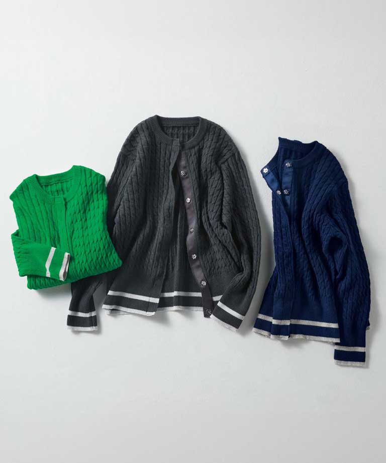 ケーブルニットってすごく素敵だけど、ちょっと甘くなりすぎちゃうから、遊び心がありつつもかわいくなりすぎない色を選びました。ネイビー、グレー、グリーン、どれもシャープな引き締めカラーで、着るだけですっきり見えるんです。