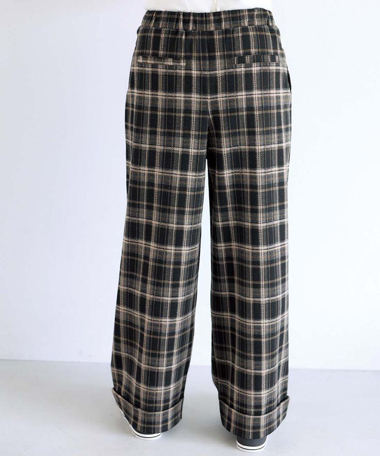 ウールみたいに見えるのに実は伸びやかなカットソー素材で、すごく動きやすいんです。長方形がベースになった大柄のチェック柄は、はいた時の縦伸び効果が抜群!何も考えずにはくだけでメリハリ感が出て、びっくりするほど美脚に見えちゃいます。柄ものに抵抗のある方もいると思うけど、このチェックはベースが暗めの色だから、すごく合わせやすい。ベーシックカラーのトップスに合わせるだけでこなれて見えるから、大人が柄ものにトライするなら、ボトムスから取り入れるのがおすすめです。