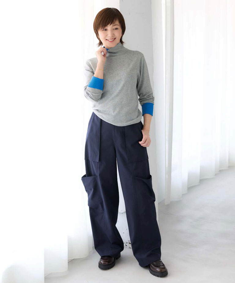 シンプル&ベーシックなお洋服って、大人世代だとお顔がのっぺり見えてしまったりして、簡単なようで意外とむずかしい。このトップスは、首と袖の裏側にチラリとアクセントカラーをきかせることで、顔まわりをパッ!と明るく見せてくれるんです。