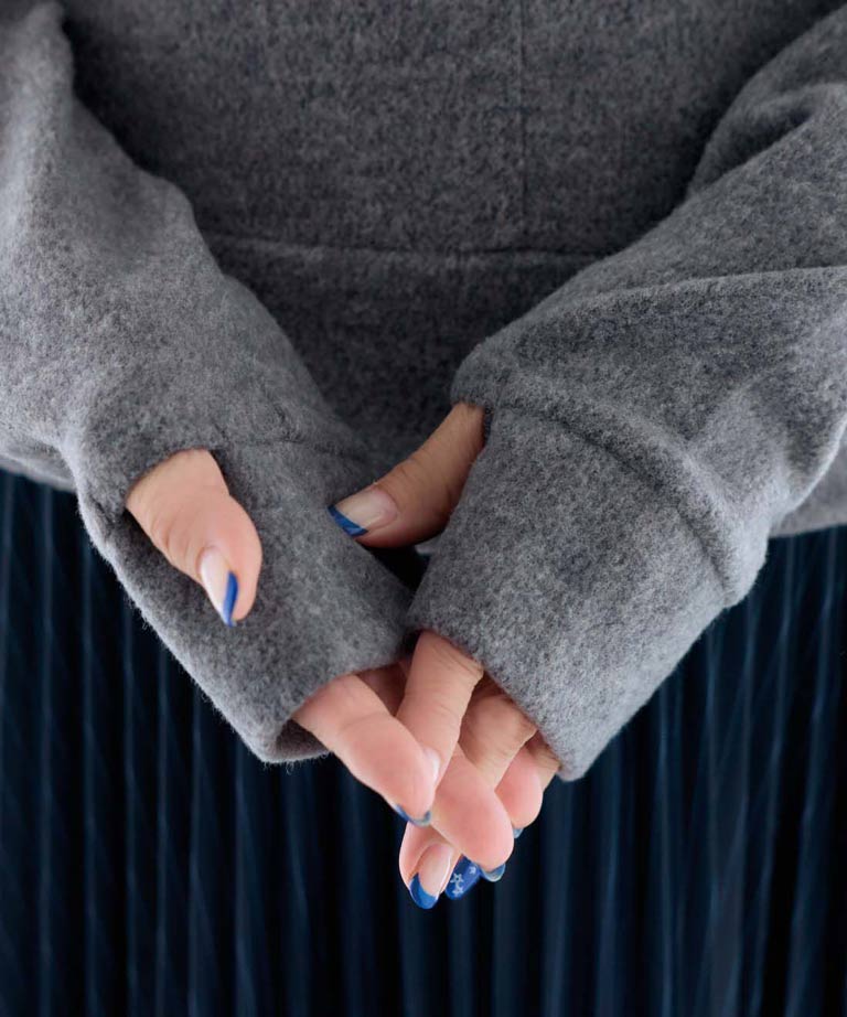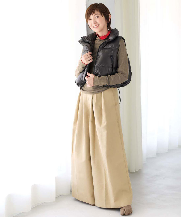 やっぱり大人世代は、冬の寒さ対策も重要だよね。トップス部分のニットソー素材は、ほどよく厚手で、だけど重くはないのがちょうどいい。袖口に付けていただいた秘密のサムホールに親指を通すと、手の甲まであったかい。親指を入れないときはホールが目立たなくなるデザインだから、すっきりとした印象で着こなせると思います。