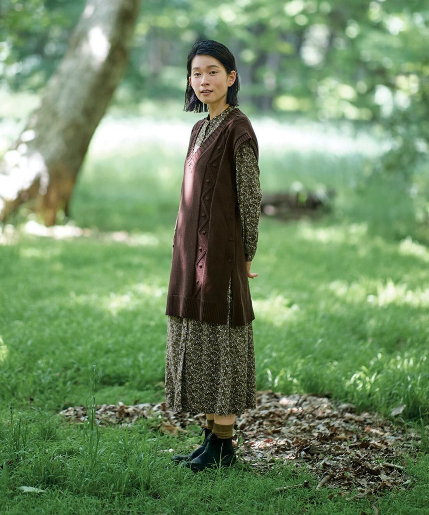 ブラウンの総柄ワンピ×ブラウンベストでこっくり秋コーデ