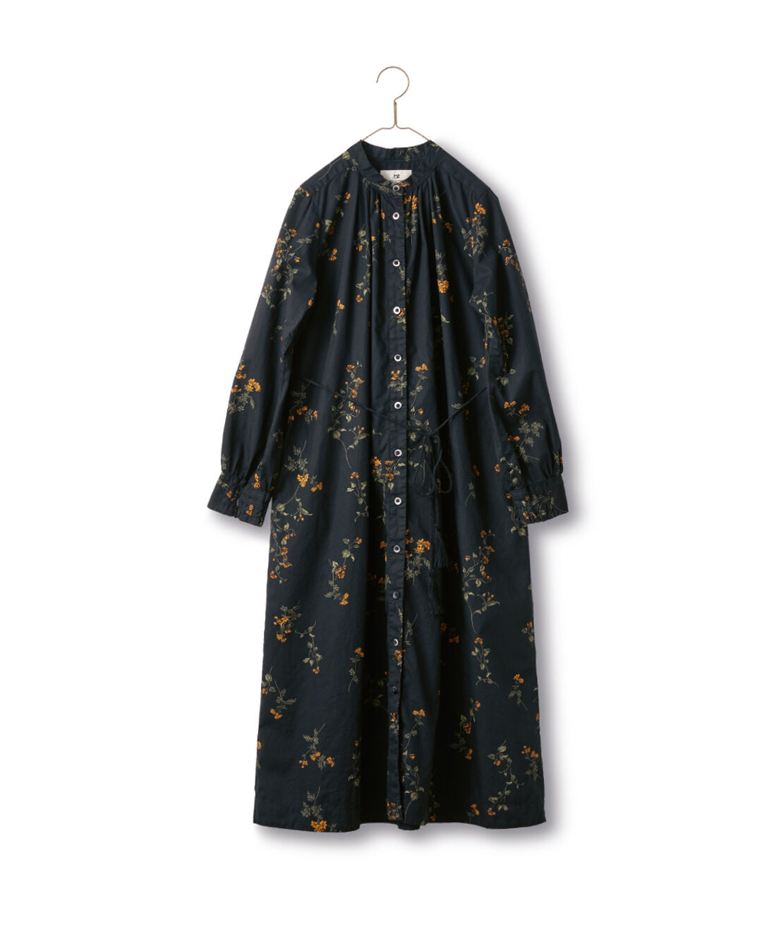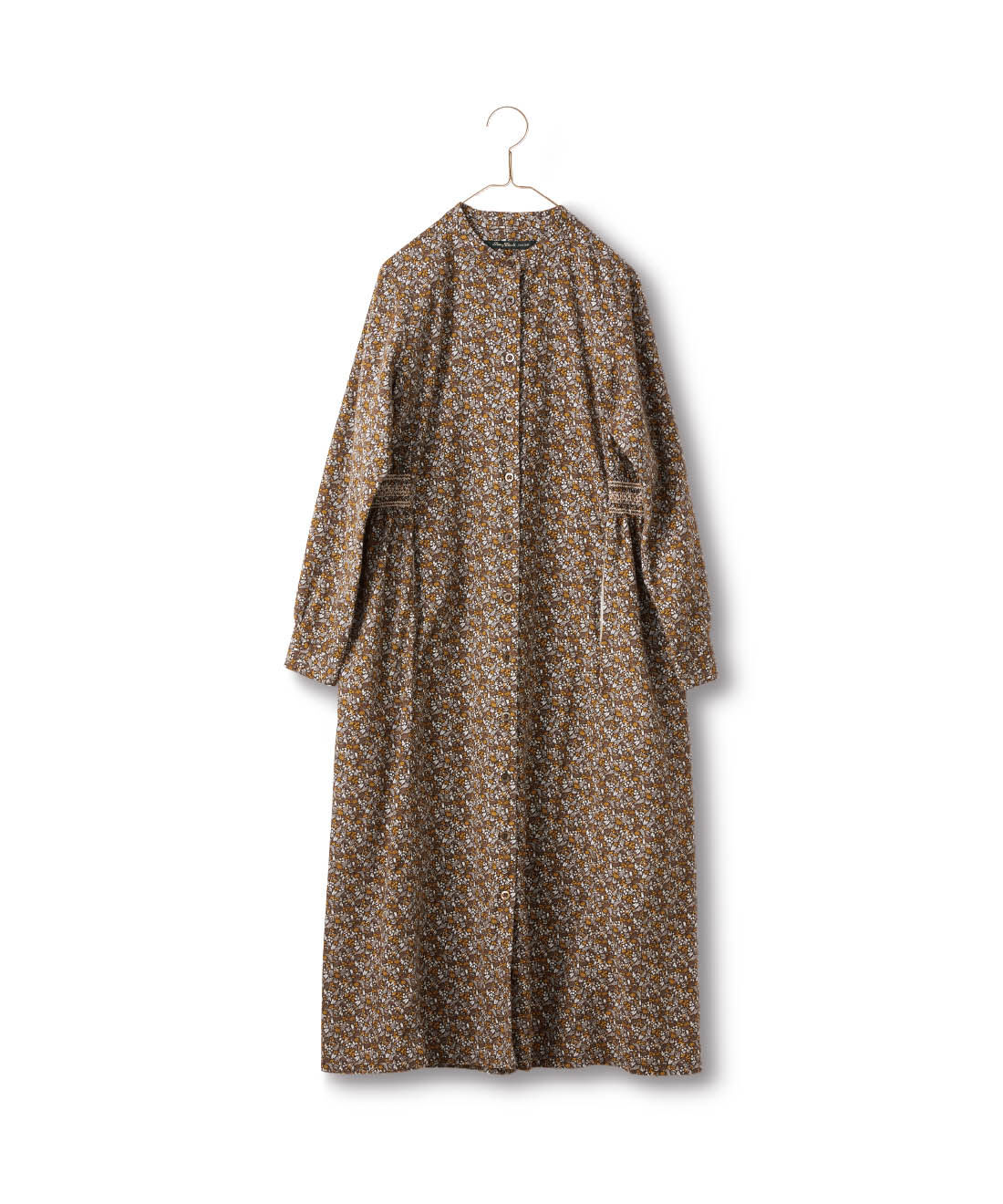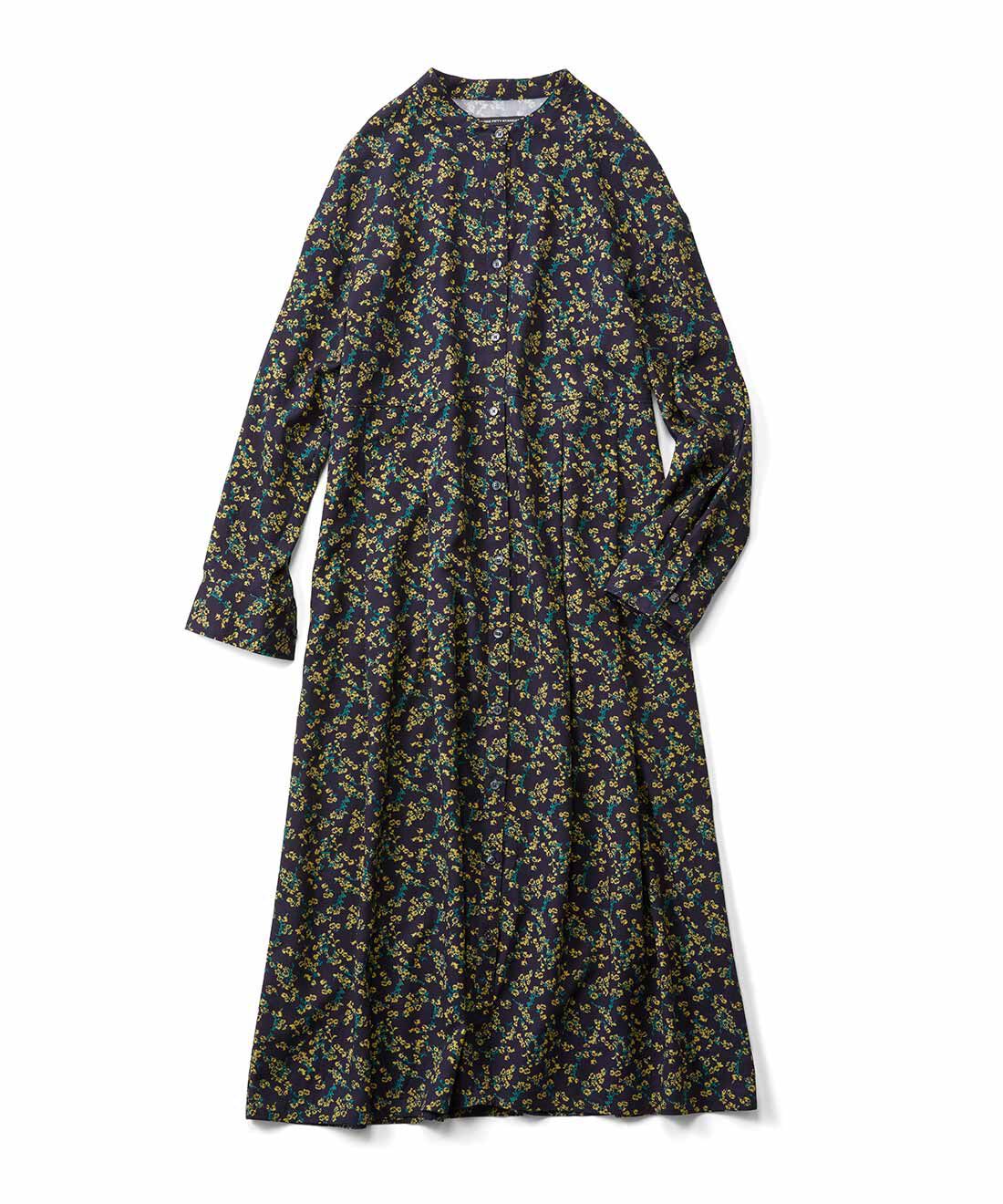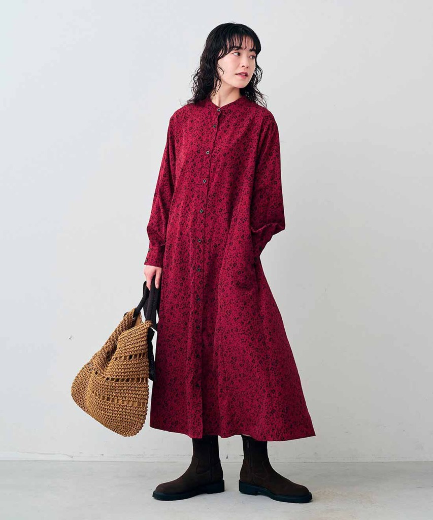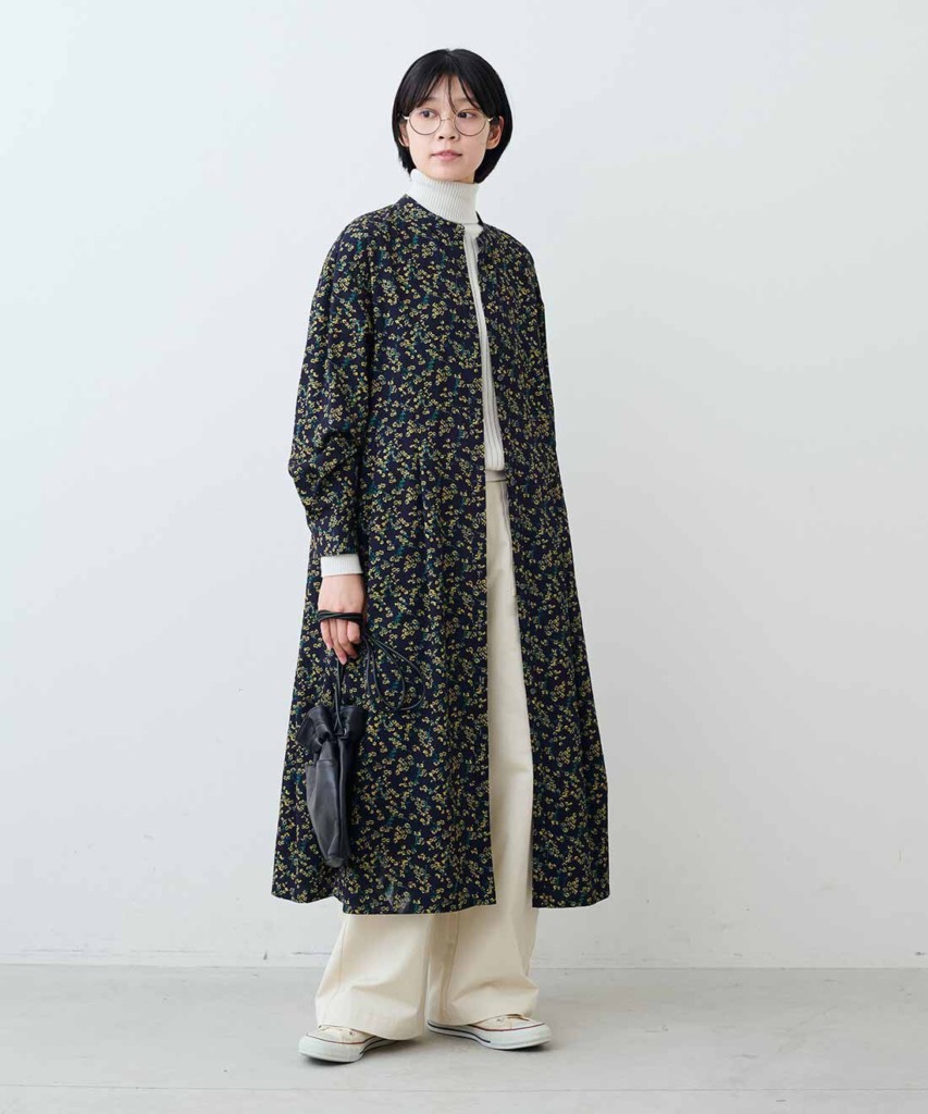 コットンレーヨンのとろみのある落ち感が羽織にもぴったりのシャツワンピ。派手になりすぎない配色と甘さ控えめの小花柄なので、大人らしく着こなせます。ウエストにタックが入っているため、パンツを重ねても美しいシルエット。タートルネックとワイドパンツを合わせて、暖かな秋冬コーデをつくります。