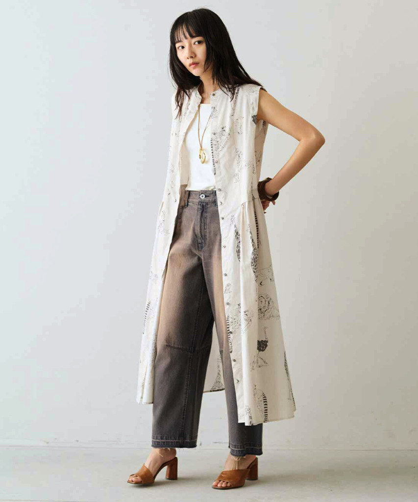 暑苦しく見えてしまいがちな重ね着も、こんなシャツワンピースならすっきり涼しげ。ジレのように軽く羽織ってふんわり着こなせる、ノースリーブがポイントです。モノトーンのトップス・ボトムスに重ねれば、スタイリッシュな仕上がりに。二の腕が気になる方は半袖のトップスを仕込んでおくと安心です。ヒールの高いサンダルと合わせてもさわやかですが、ぺたんこサンダルでカジュアルダウンさせても決まります。