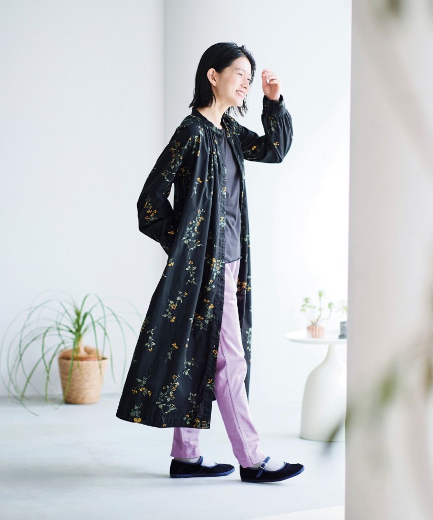 深みのある草花柄が美しい、総柄のシャツワンピース。派手すぎないか気になる方は、アウターとして取り入れるのもおすすめです。シンプルな色味のトップスと、明るいパープルのボトムスでバランスを取りましょう。軽やかな素材なので、レイヤードコーデもすっきり上品に決まりますよ。