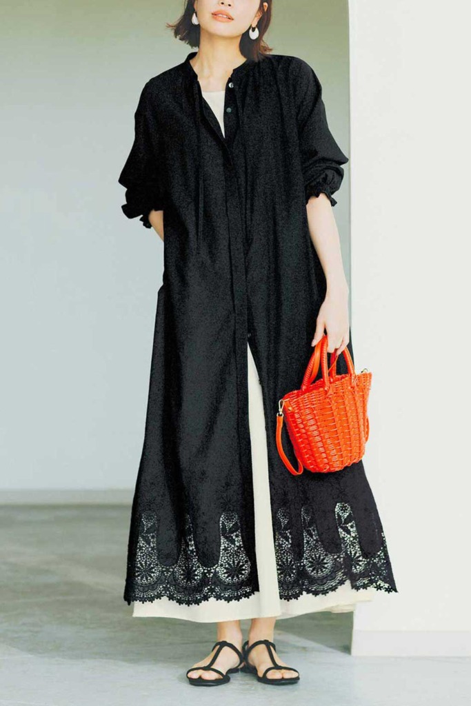ベーシックな黒色で落ち着きがありながらもすその繊細なレースで華やかさを演出したシャツワンピース。白のワンピースとのレイヤードで、落ち着きはそのままに目を引く甘さも加えるコーデがおすすめです。ポイントはバッグや小物でカラーを取り入れること。前のボタンを上下ともに開けることで、よりこなれた軽やかさをプラスできます。