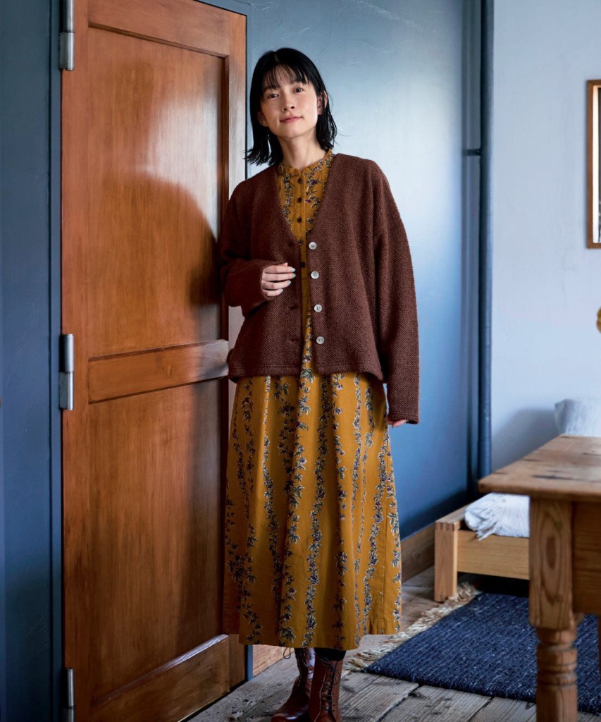すっきりとしたAラインシルエットのワンピースには、ボリュームのあるカーディガンを。ゆるっとした身幅のカーディガンも、トレンドの短め丈にすると重心が上がってスタイルアップがかないます。ワンピースの色に合わせて、暖色系でまとめるとほっこりあたたかなコーデに。大人かわいい秋冬スタイルです。