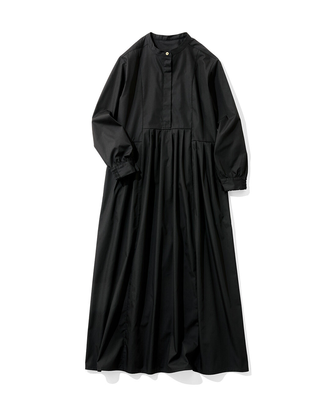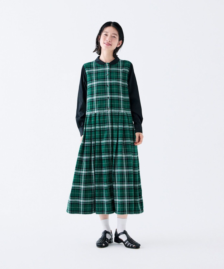 しなやかな落ち感が魅力の黒ワンピースは、羽織りとしても大活躍。ピンタックとウエストギャザーのアクセントで、コーデに立体感が生まれます。クルーネックニット×グレーのチェックパンツに羽織って、シックなモノトーンコーデに。シャツワンピで視線を縦に流すことで、スタイルアップも狙えますよ。