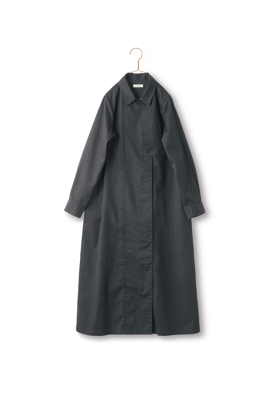 コートとしても着られる欲張りなシャツワンピース。細糸を打ち込んだツイル生地を使っているので、トレンチコートのディテールが盛り込まれているのに重くなりません。ワンピースとしての着こなしをメインにデザインされているので、一枚で着てもしっかり馴染みます。