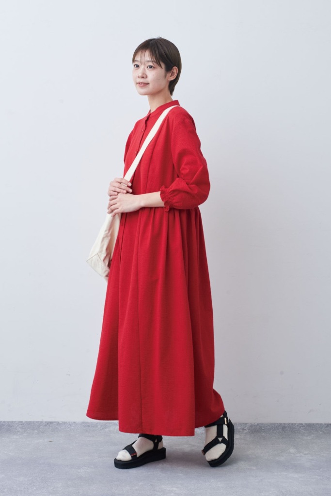 しわになりにくいサッカー素材でできた、華やかなレッドのシャツワンピース。潔く1枚で着こなして、存在感のあるミニショルダーをアクセントに。足もとに白など明るい色味を持ってくると、抜け感のあるコーデが完成します。サンダルに靴下をあわせるのも、定番になりつつある、トレンドのひとつです。