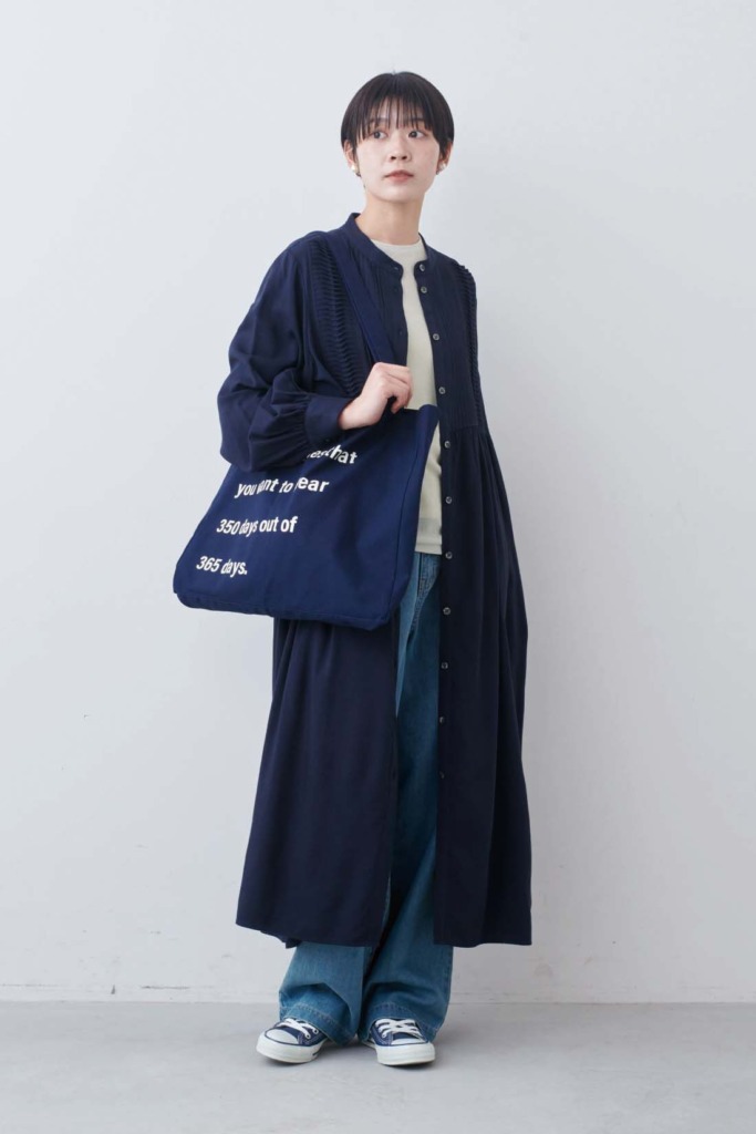 無難にまとまりがちなネイビーのシャツワンピースを、簡単印象チェンジ。コットンのインナーワンピースを仕込んで、軽やかな表情を出しましょう。前ボタンは半分だけ留めて、きれいなAラインシルエットをつくるのがコツ。脚さばきよく、ふわっとした生地感も心地いいコーデです。