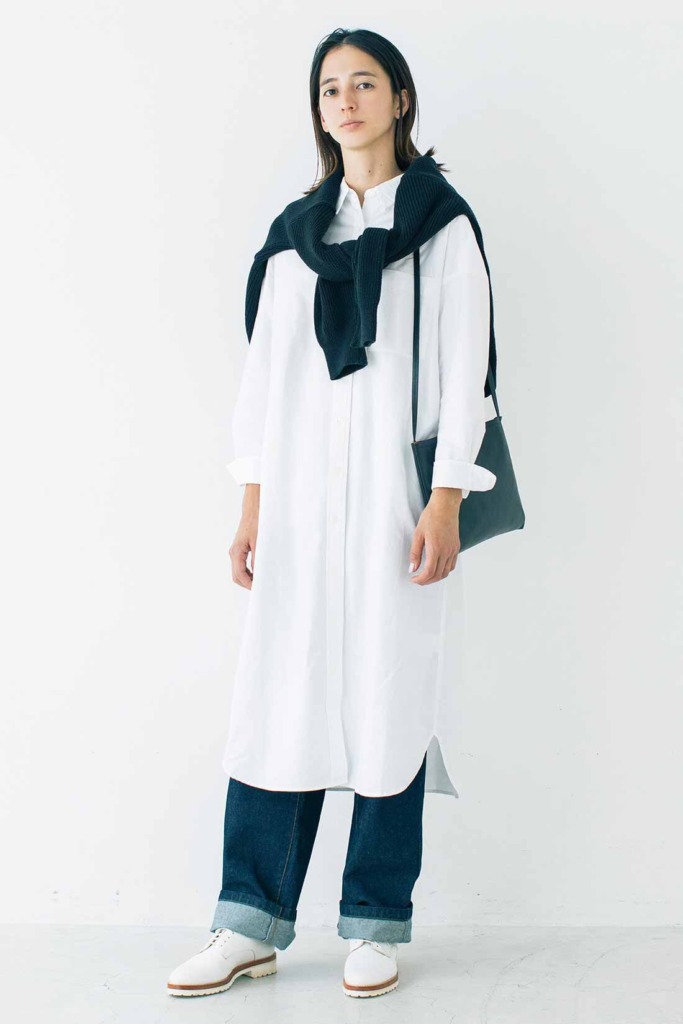 ベーシックなオックス生地で作られたシンプルなシャツワンピースは、オールシーズン着まわせます。シンプルだからこそ、一枚で着ても洗練された印象に。セーターやベストなどの重ね着はもちろん、肩にかけるだけでも様になります。中にTシャツを着てはおりとしても使えるので、文字通り季節を問わない、一枚あると安心のワンピースです。