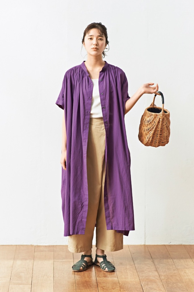 フロントから後ろヨークにかけてギャザーをたっぷりと寄せた、ドレープ感が美しいワンピース。一枚でさらりと着ることが多い夏のワンピは、新鮮なカラーが一枚あると便利です。透け感のある薄手のコットン素材は、繊細なギャザーを際立たせてくれます。