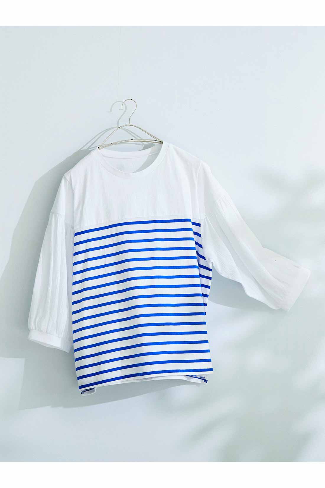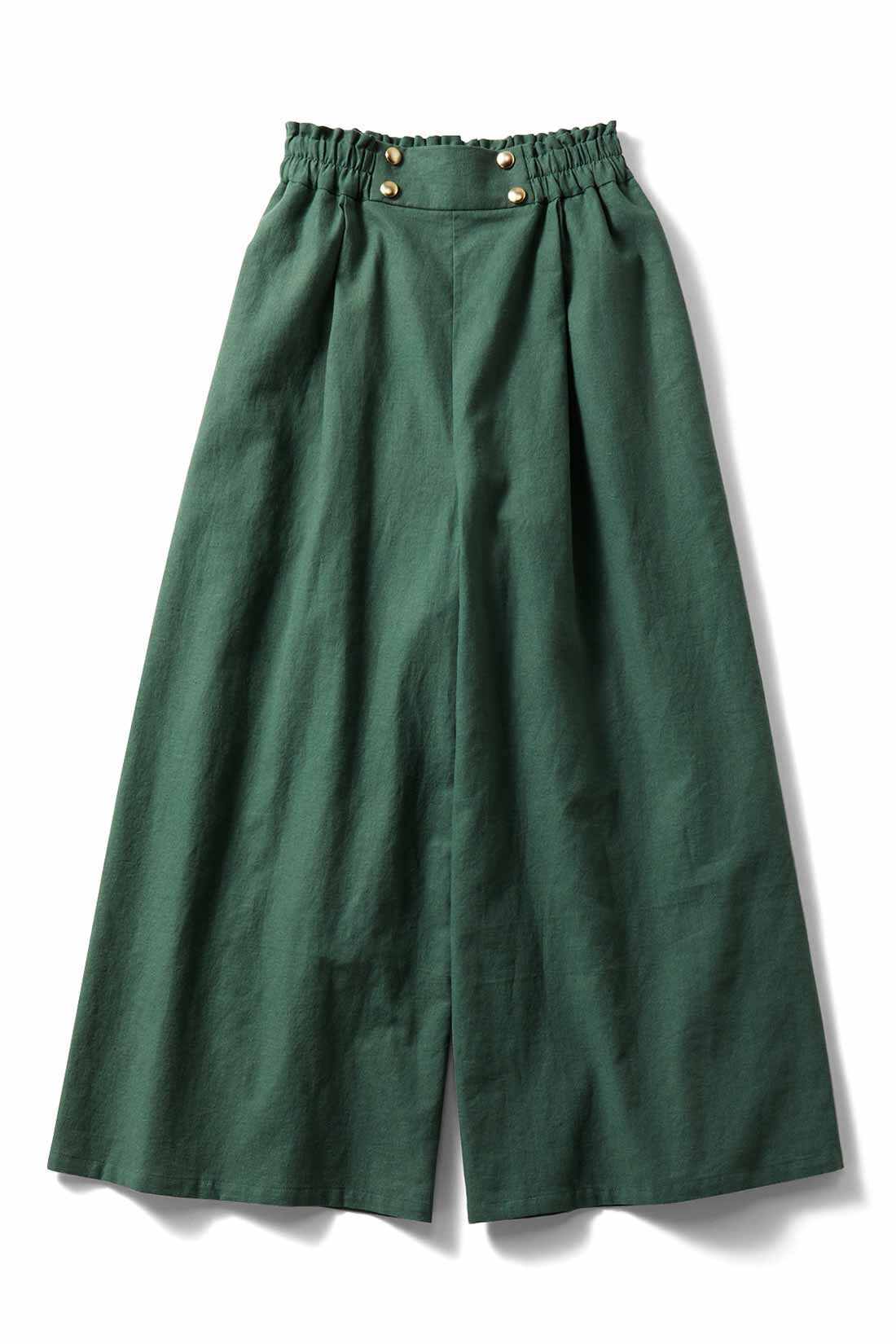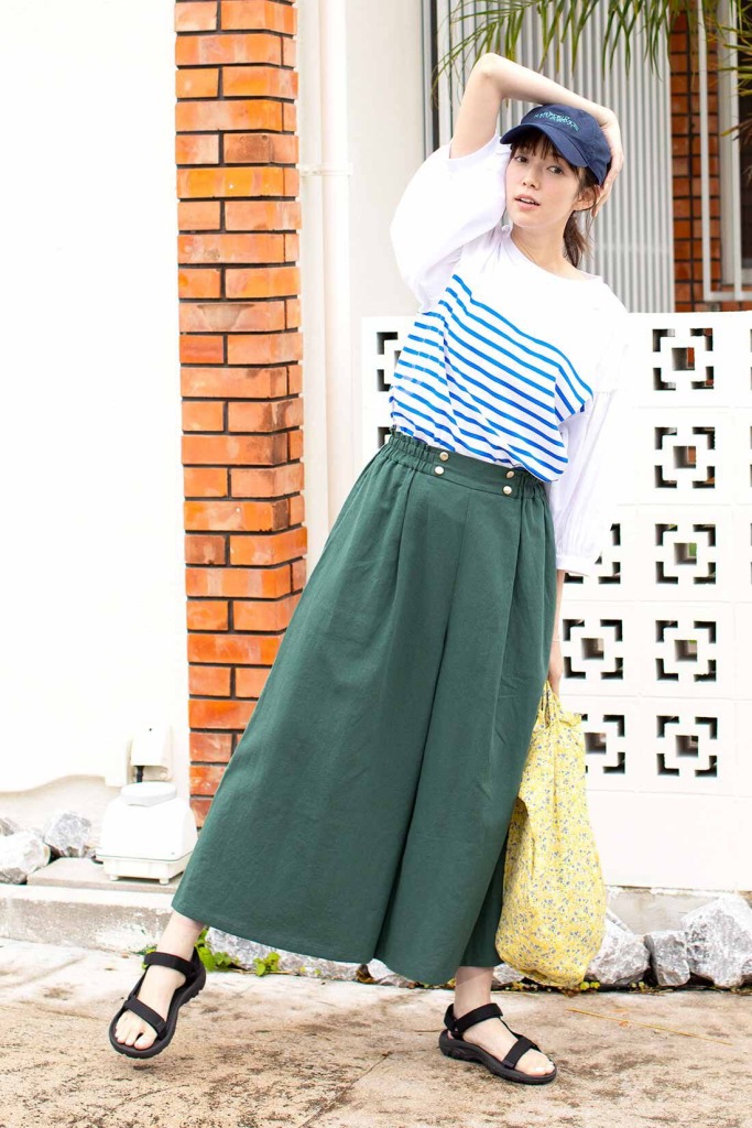 こなれ感のあるフォレストグリーンのガウチョパンツは、春夏にぴったりの麻混素材。ゴールドボタンがついているので、タックインもおしゃれに決まります。さわやかなボーダートップスは、楊柳素材の袖切り替えがポイント。毎日着たくなる、リラクシーな着映えカジュアルコーデです。