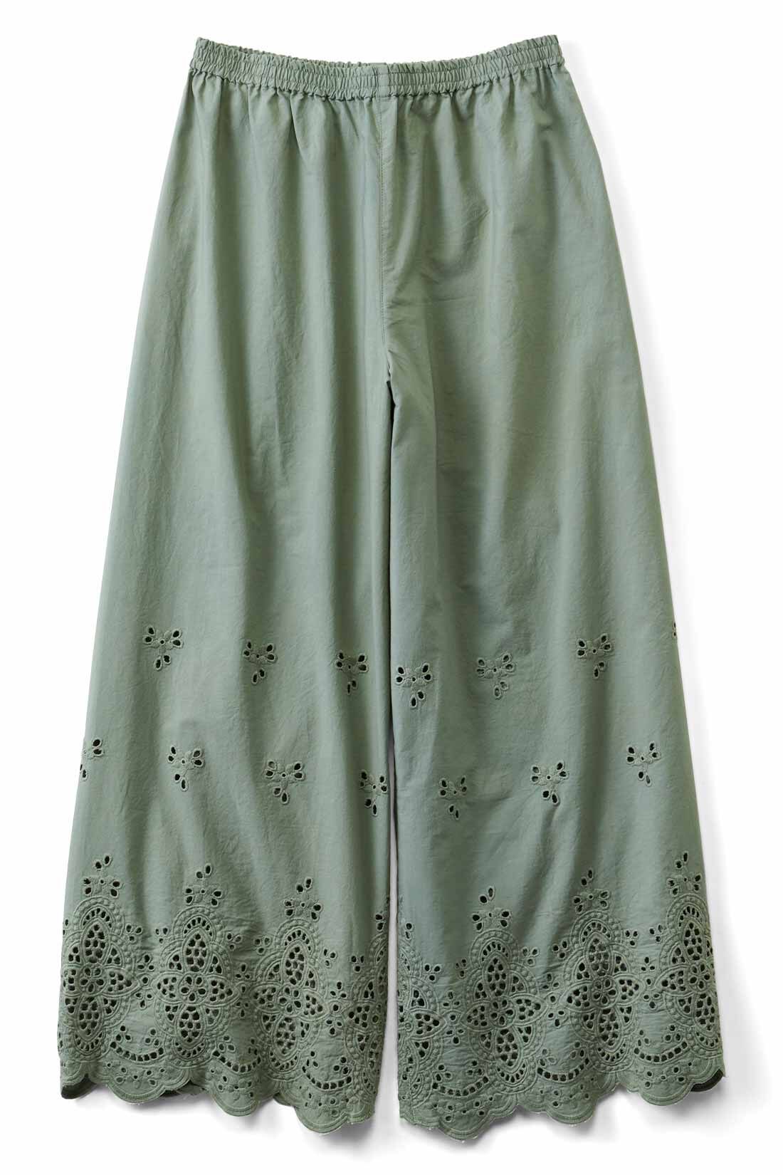 スモーキーなカーキ色に、すそのレースで華やぎを加えたガウチョパンツ。メンズライクになりがちなパンツスタイルに、ほどよく女っぽさを加えられます。白ブラウス×オートミール色のカーディガンで、春のナチュラルスタイルに。やさしげな色合わせに、心もほぐれそうなコーデです。