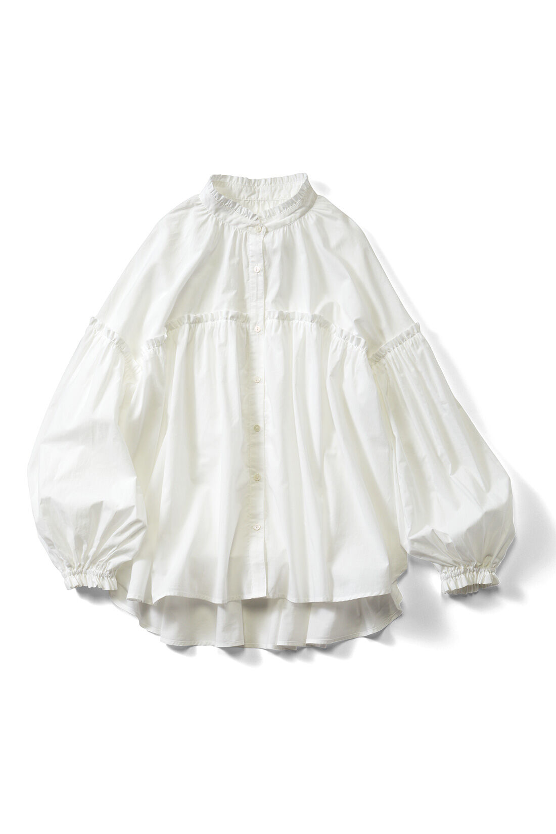 ふんわり風をまとうような、薄手コットンの白ブラウス。きれいめパンツを合わせても素敵ですが、総柄ガウチョにすると新鮮なコーデに。くすみイエロー&大きな花柄が、民族っぽいこなれ感を演出してくれます。足もとは白サンダルを選んで、春夏らしい清潔感も加えましょう。