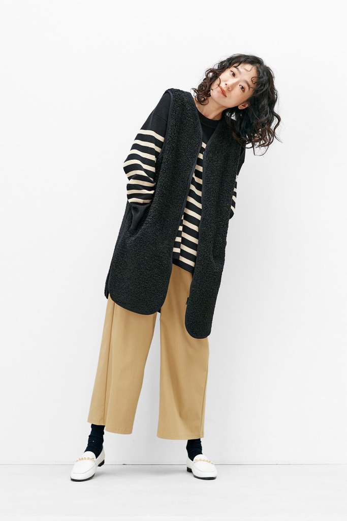 軽くて伸びやかな素材でできたガウチョパンツは、通年使えるすぐれもの。合わせやすいベージュカラーを選べば、ヘビロテ間違いありません。ボーダートップスにキルティングベストを合わせて、秋らしい装いに。くるぶしが見える丈のおかげで、レイヤードコーデも軽やかに仕上がりますよ。