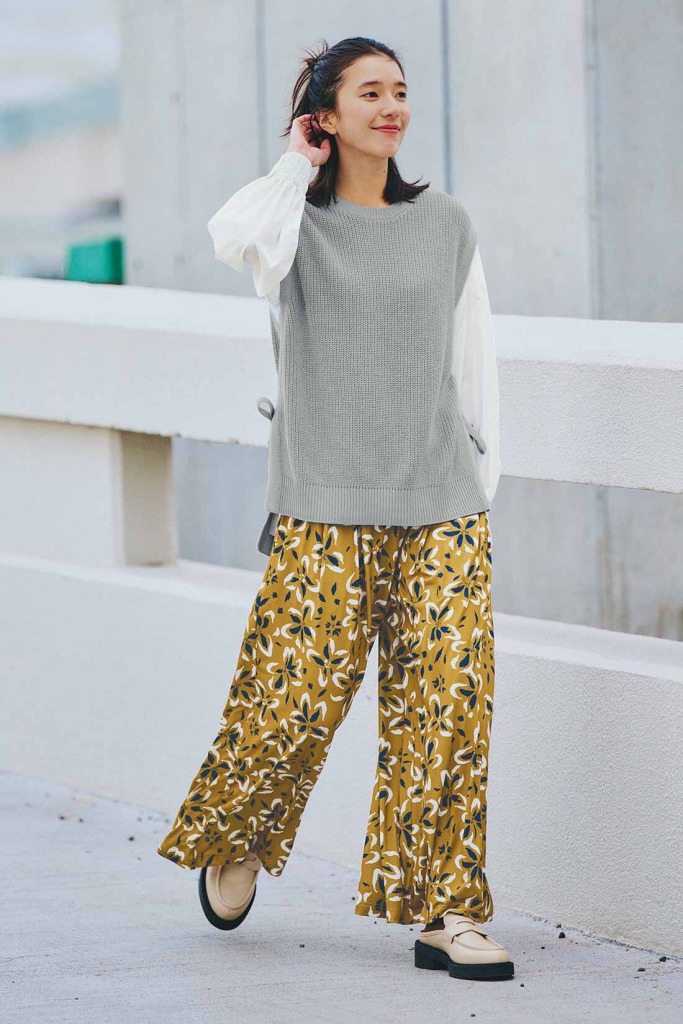 主役級の花柄ガウチョパンツで遊び心のあるコーデに