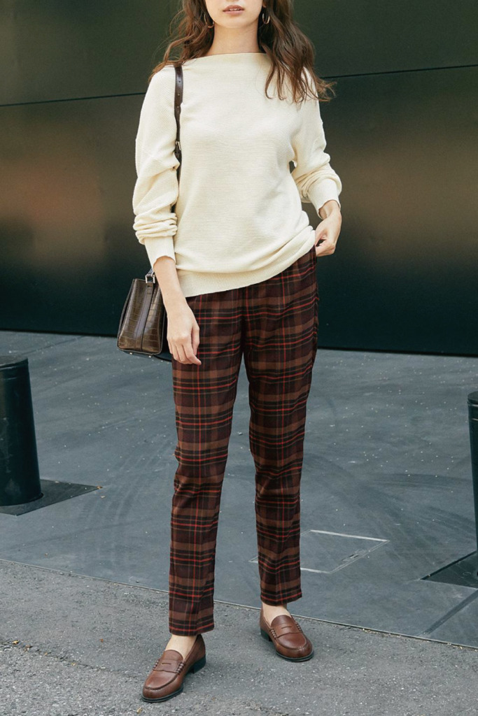 きれいめコーデでは、チェック柄パンツ×ニットのほっこり感は避けたいところです。上品なこなれ感をニットで出すには、肩落ちのハイゲージニットがベスト。少しゆるっとしたシルエットでさりげなく体型カバーをしつつ、アイボリーで顔周りを明るくしましょう。首元にも注目して、いつものVネックとは違うボートネックを選ぶのもあり。トップス以外はブラウンでまとめるなど、色数を増やさないのも大人スタイルのポイントです。